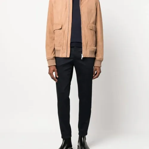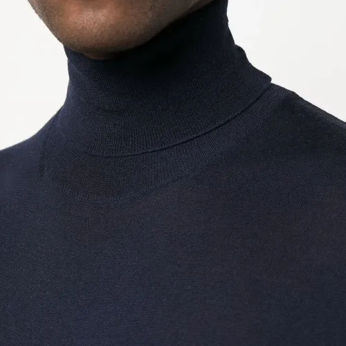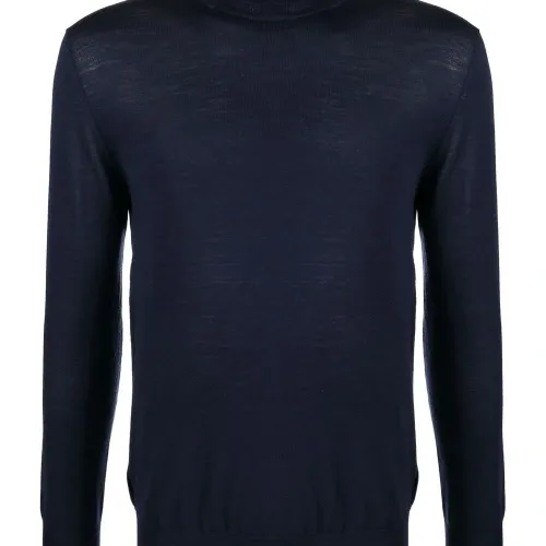 Темно-синий, необработанная шерсть, тонкая вязка, высокий воротник, длинные рукава и подол в рубчик.