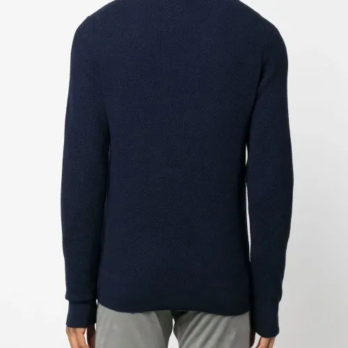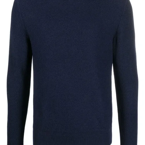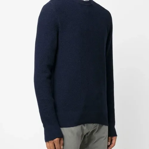 Темно-синий, необработанная шерсть, тонкая вязка, круглый вырез, длинные рукава и прямой подол.