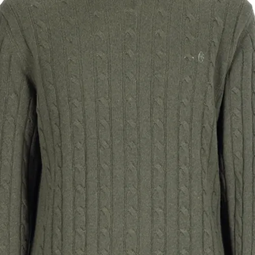 зелёный вязаный узором «косы» круглый вырез шерсть вышитый логотип длинные рукава