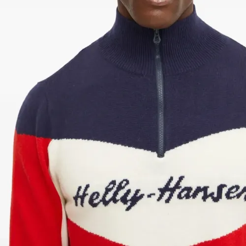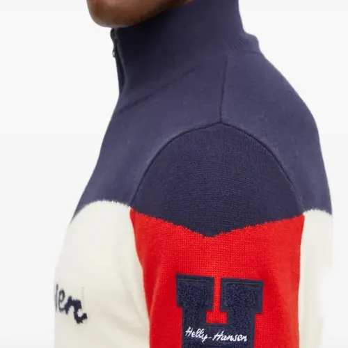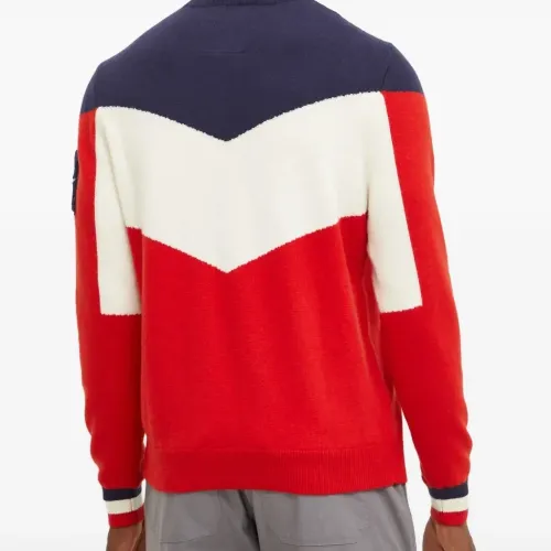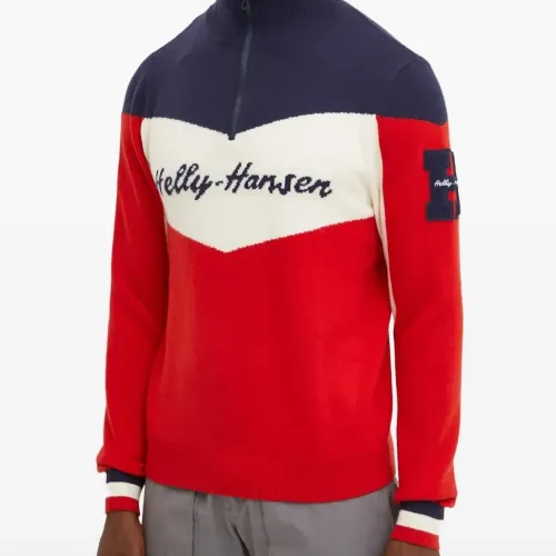 красная водолазка в блок-стиле с полумолнией, фирменной нашивкой и ребристыми манжетами