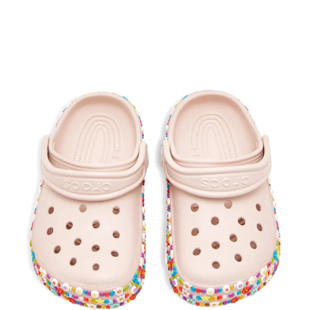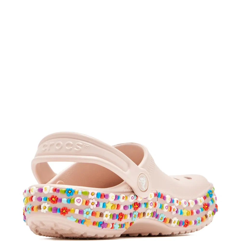 светло-розовые, с множественными украшениями, логотипом, круглым носком, ремешком на пятке, перфорацией