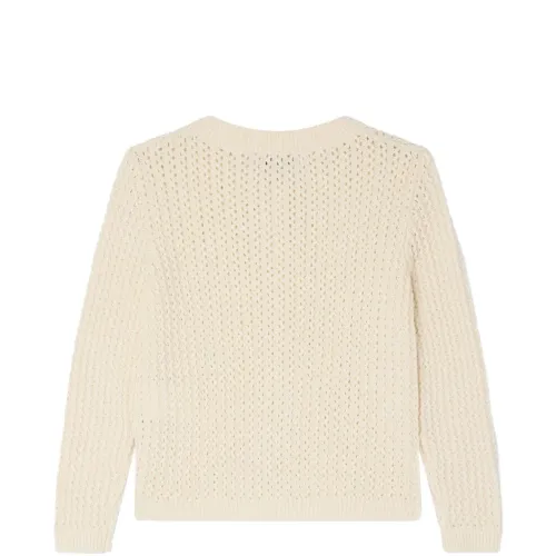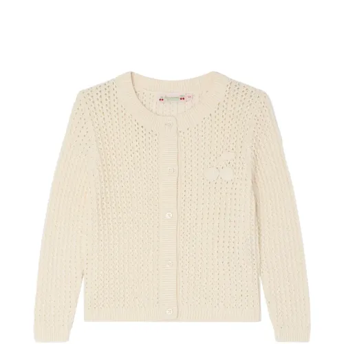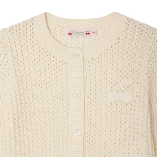 бежевый с аппликацией, застёжка на пуговицы, круглый вырез, длинные рукава, ажурная вязка