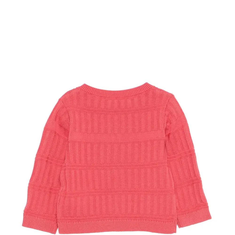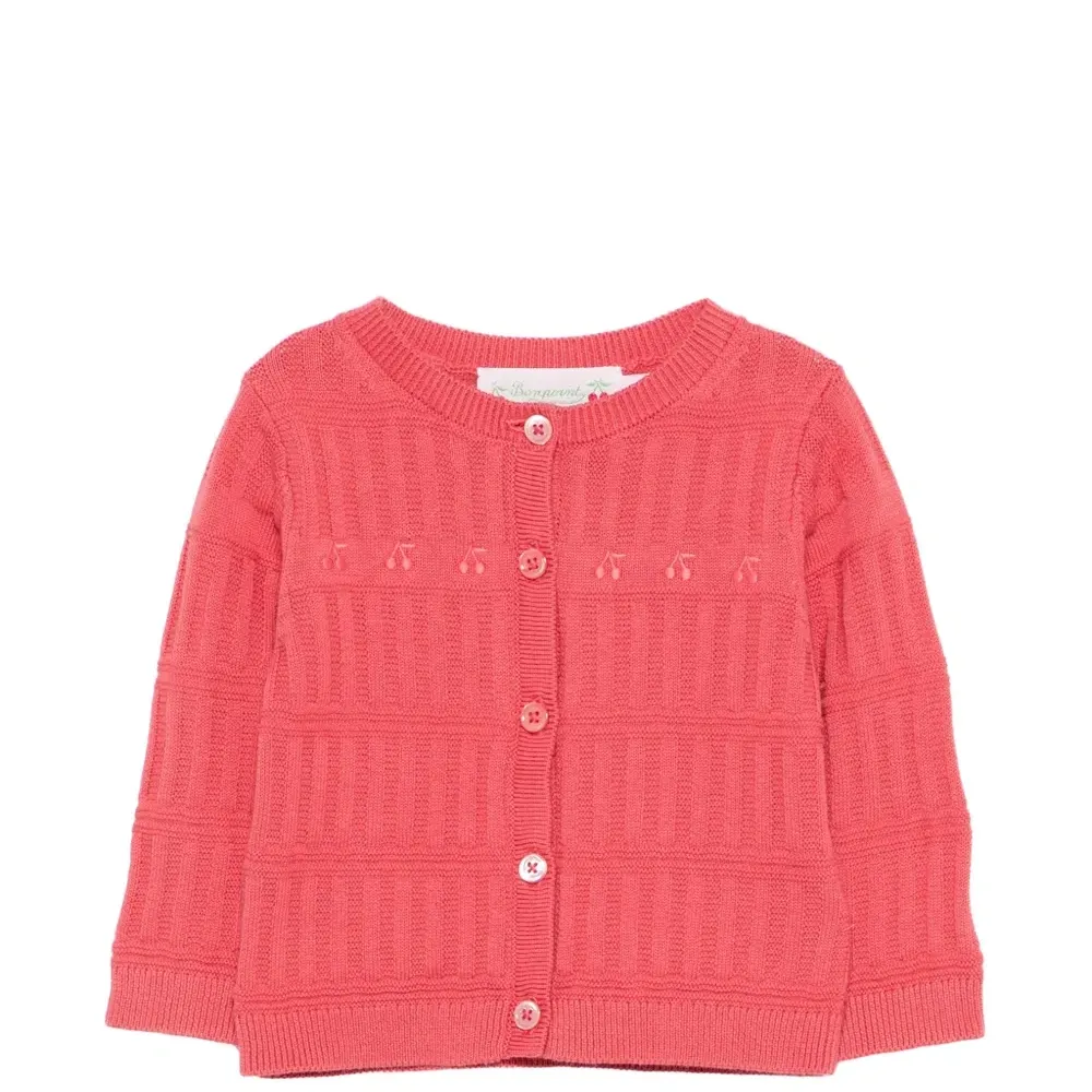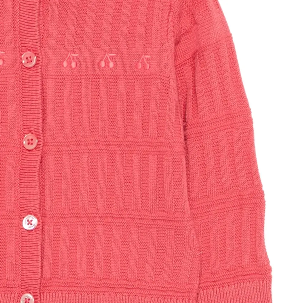 красная вишневая аппликация, фактурная вязка, рубчатые края, застежка на пуговицы спереди, круглый вырез