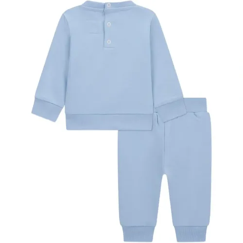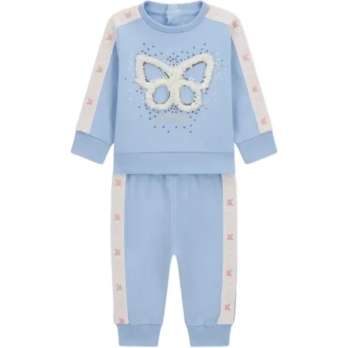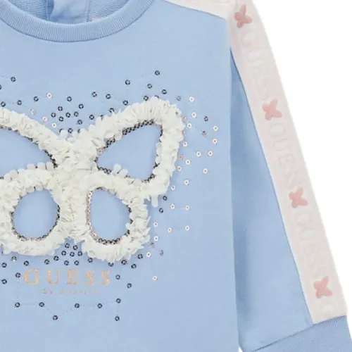 синяя отделка пайетками, декоративная лента, аппликация, тесьма с логотипом, застёжка на пуговицу сзади