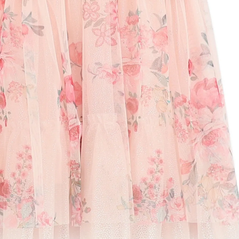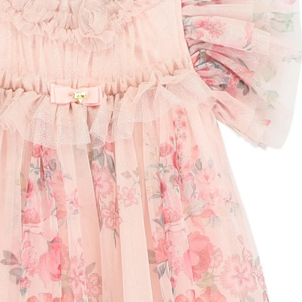 розовый топ с цветочным принтом, украшением в виде банта и рюшами