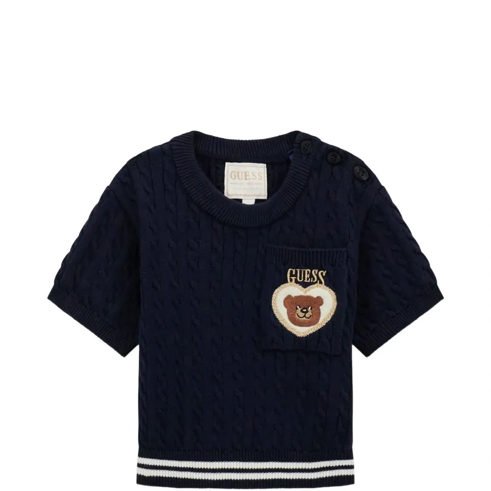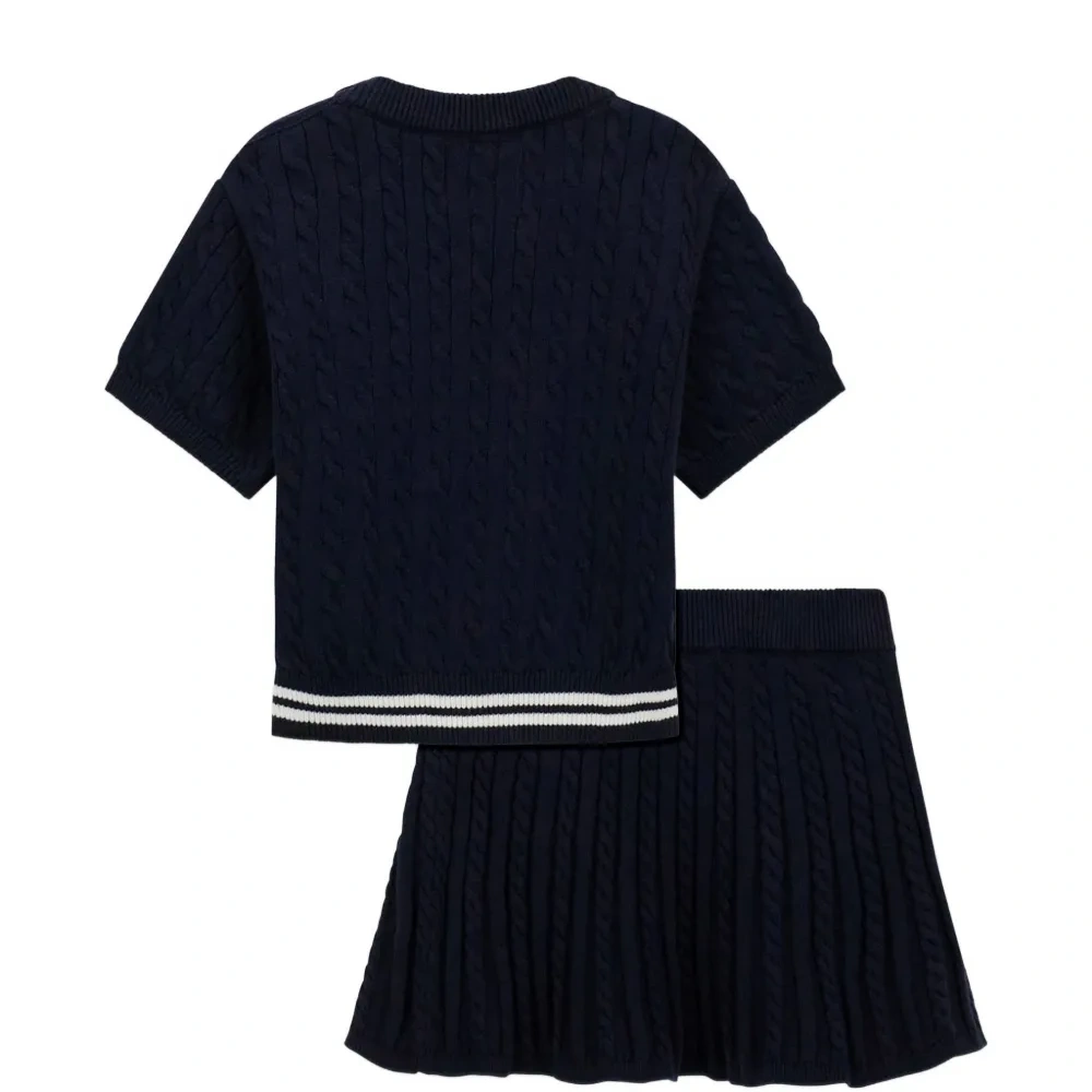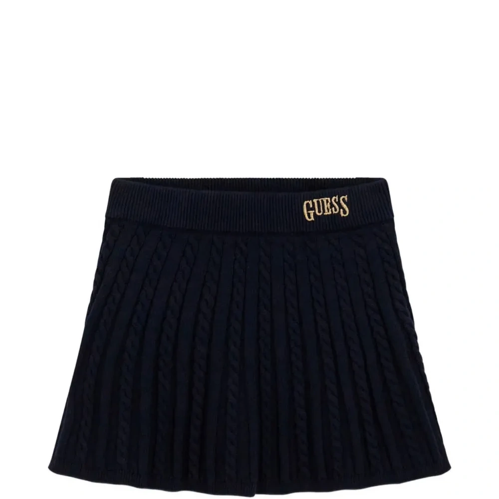 темно-синяя юбка А-силуэта с косичками, логотипом, мотивом медвежонка, полосатой отделкой, эластичным поясом и плиссированными деталями