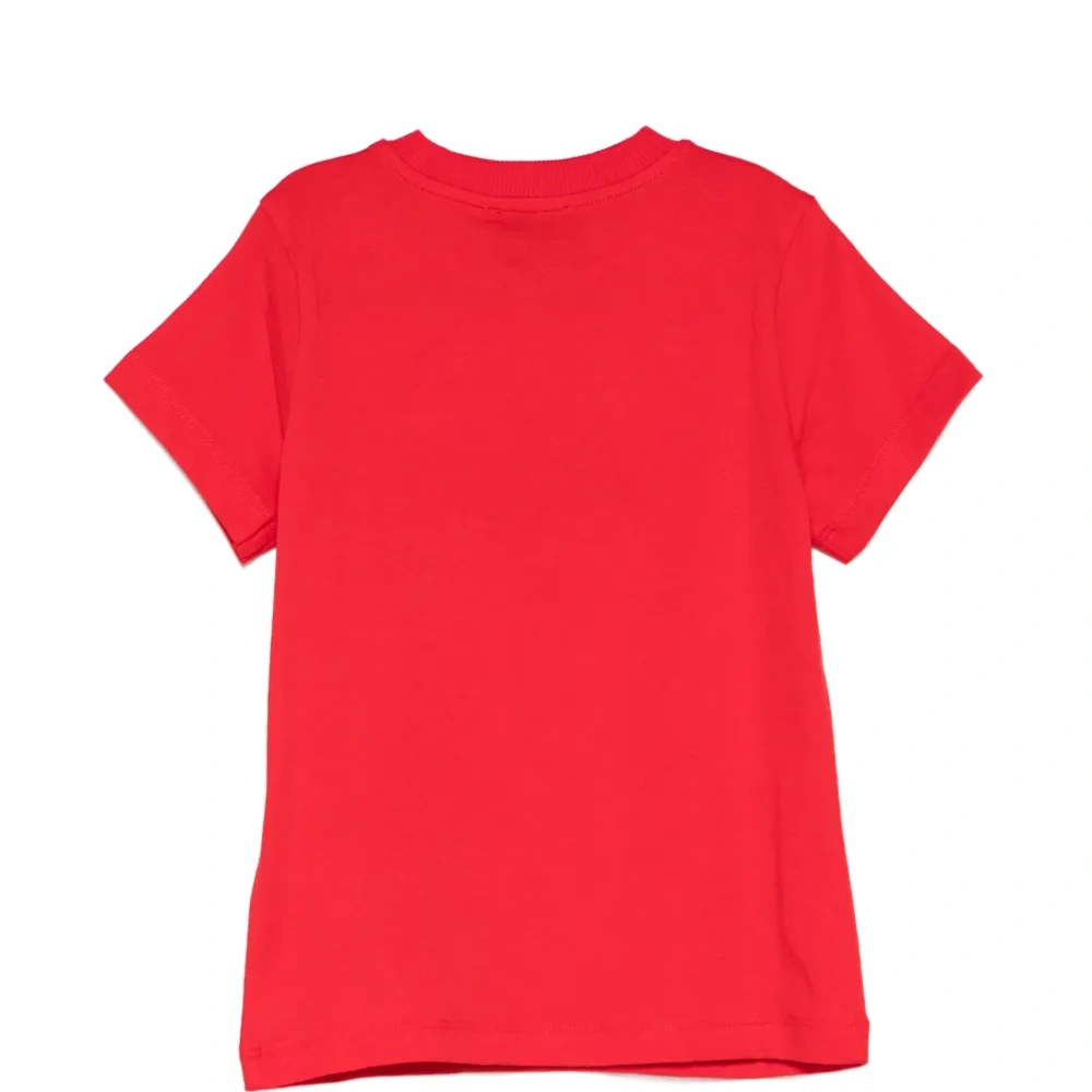 маковое красное платье с надписью-логотипом, отделкой под «тедди», круглым вырезом и короткими рукавами