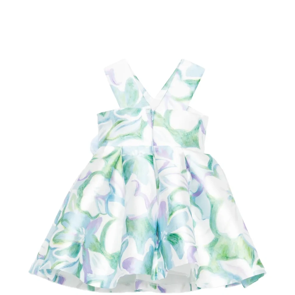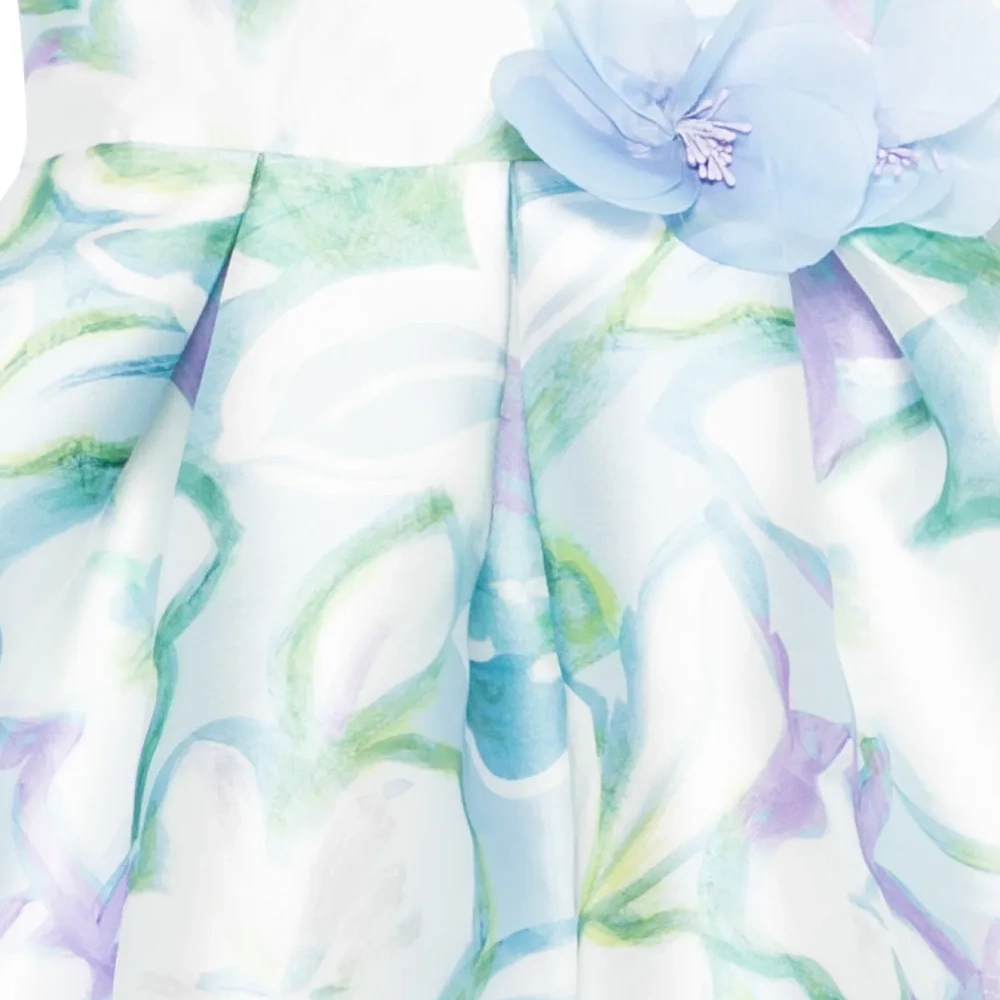 светло-голубое платье без рукавов с цветочным принтом, цветочной аппликацией и плиссированной юбкой