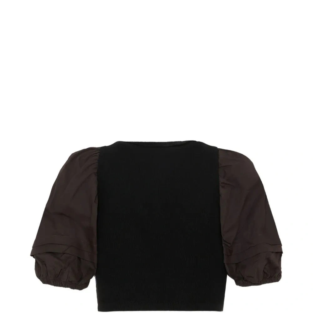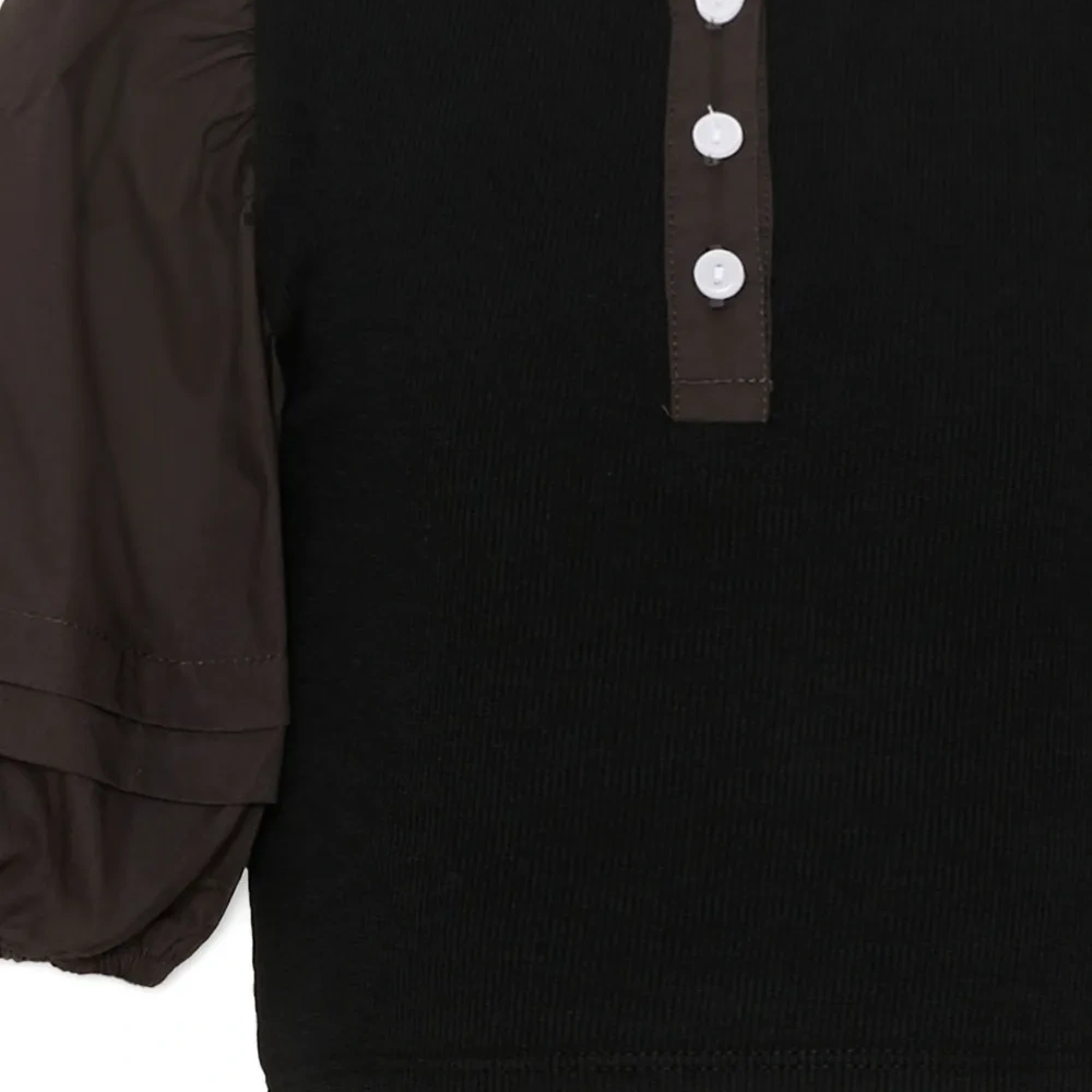 черная футболка из органического хлопкового микса с круглым вырезом, застежкой на пуговицы, короткими рукавами и эффектом многослойности на рукавах