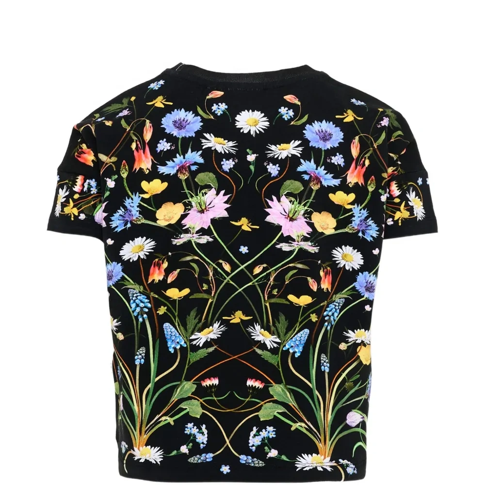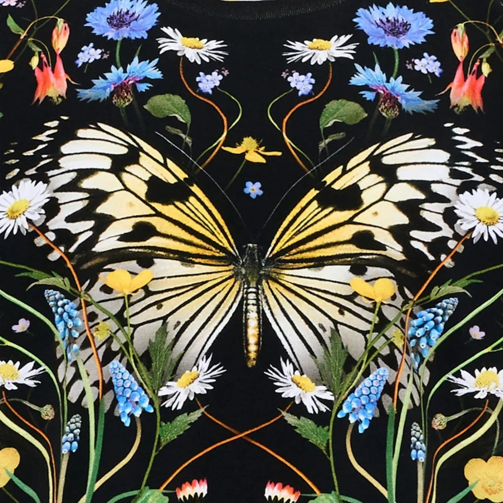 чёрная футболка с цветочным принтом, мотивом бабочек, круглым вырезом и короткими рукавами