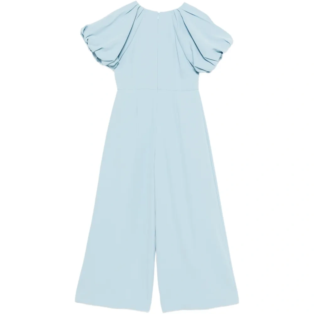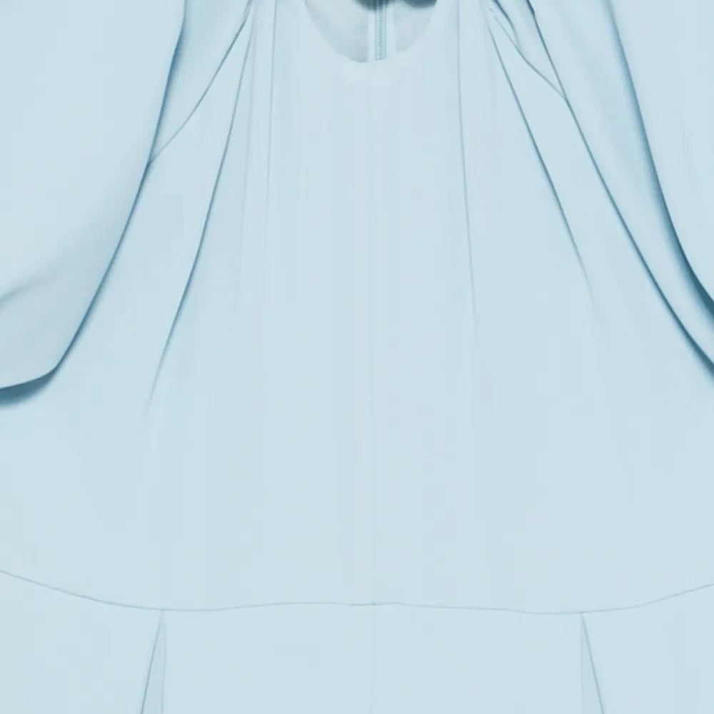 небесно-голубые короткие рукава-фонарики, застежка-молния сзади, плиссированные детали