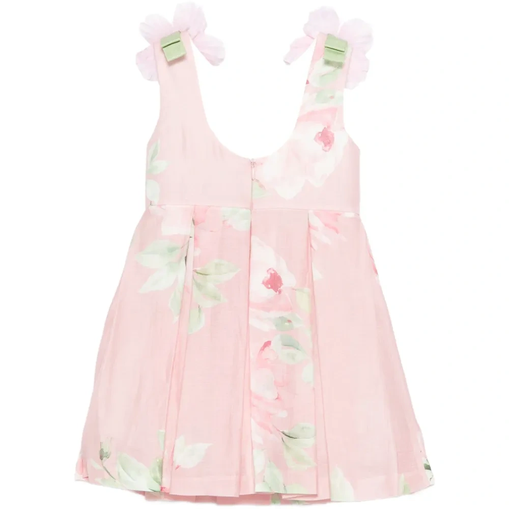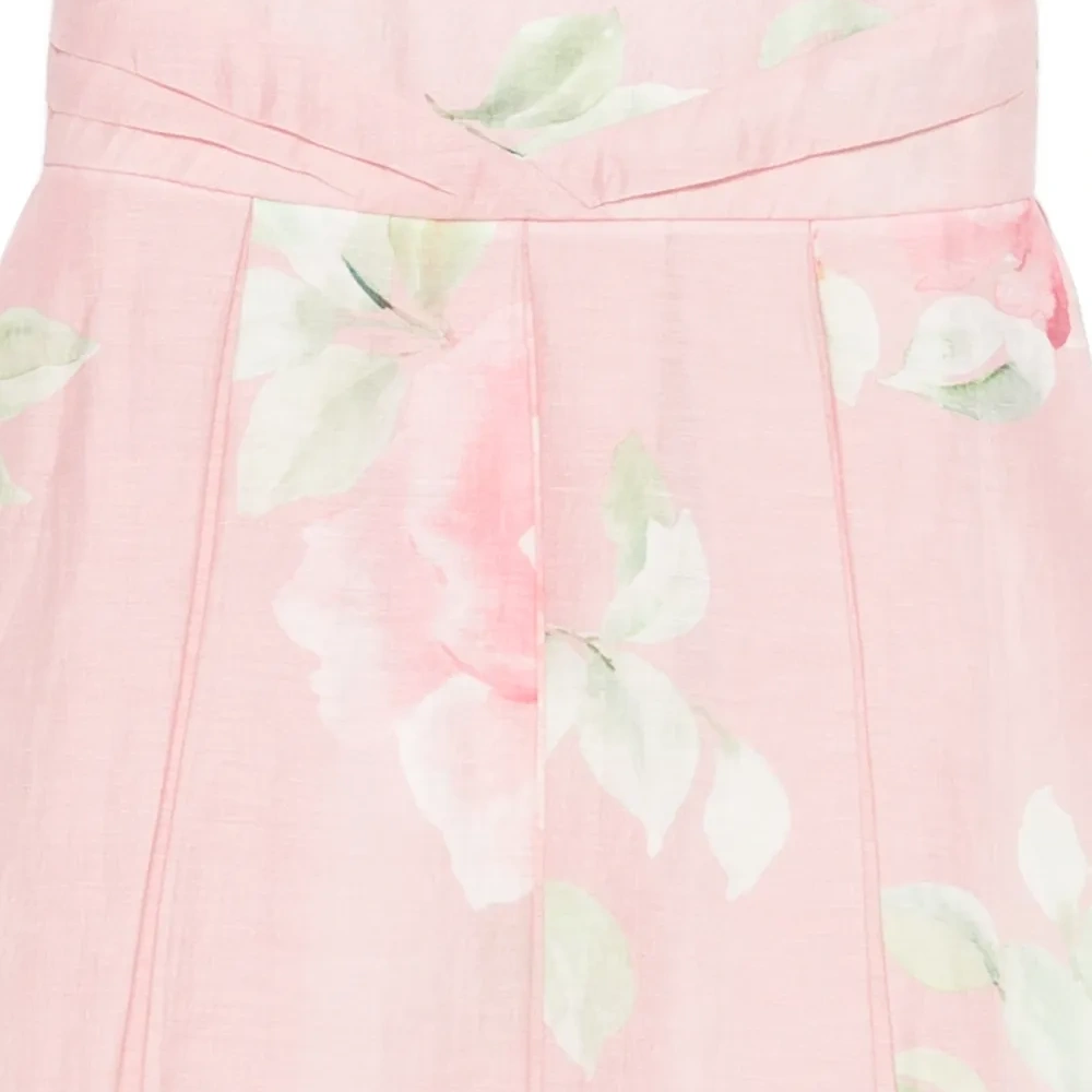 розовое платье без рукавов с цветочным принтом, отделкой в виде цветка, плиссировкой и скрытой молнией