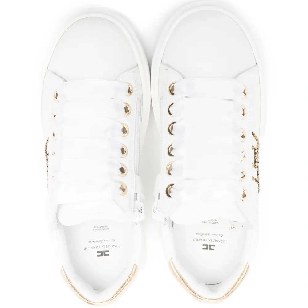 белая кожа, украшение с логотипом в золотистом цвете, шнуровка