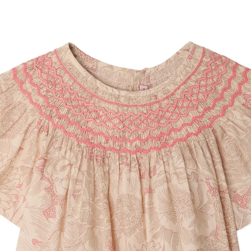 бежевый и розовый с цветочным принтом, короткие рукава, круглый вырез горловины, застежка на пуговицы сзади