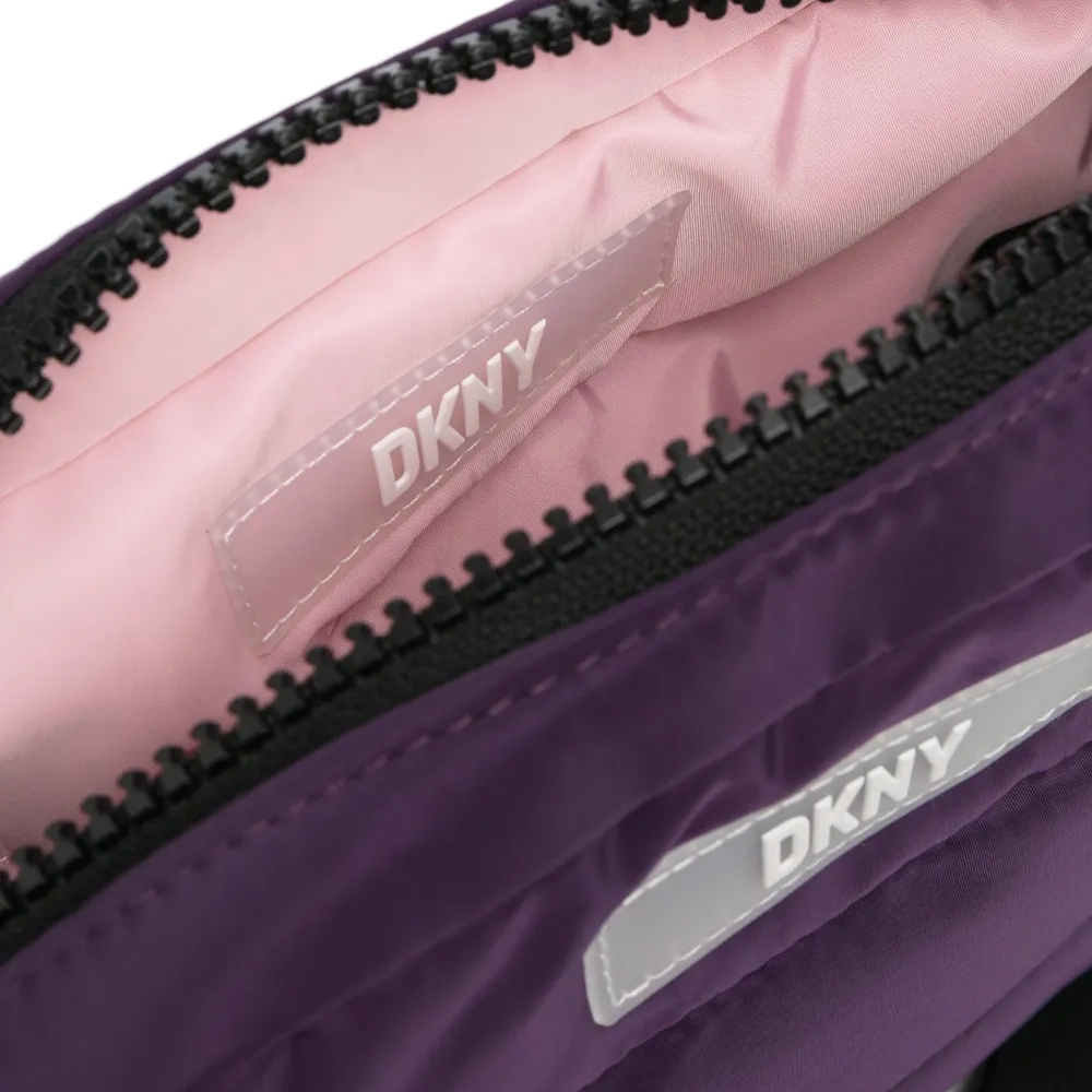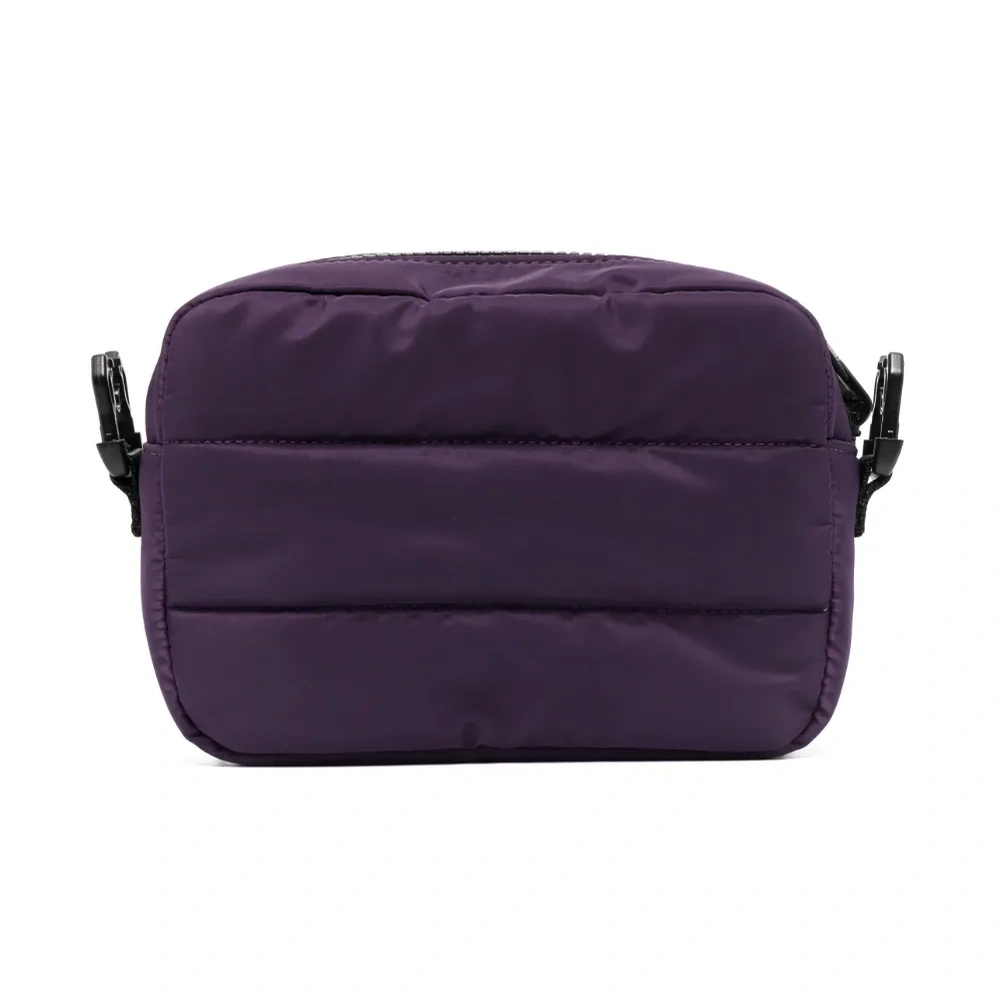 Фиолетовый, розовый, двусторонний дизайн, дутый материал, прорезиненный логотип, съемный ремень на плечо, застежка на молнии сверху и основное отделение.