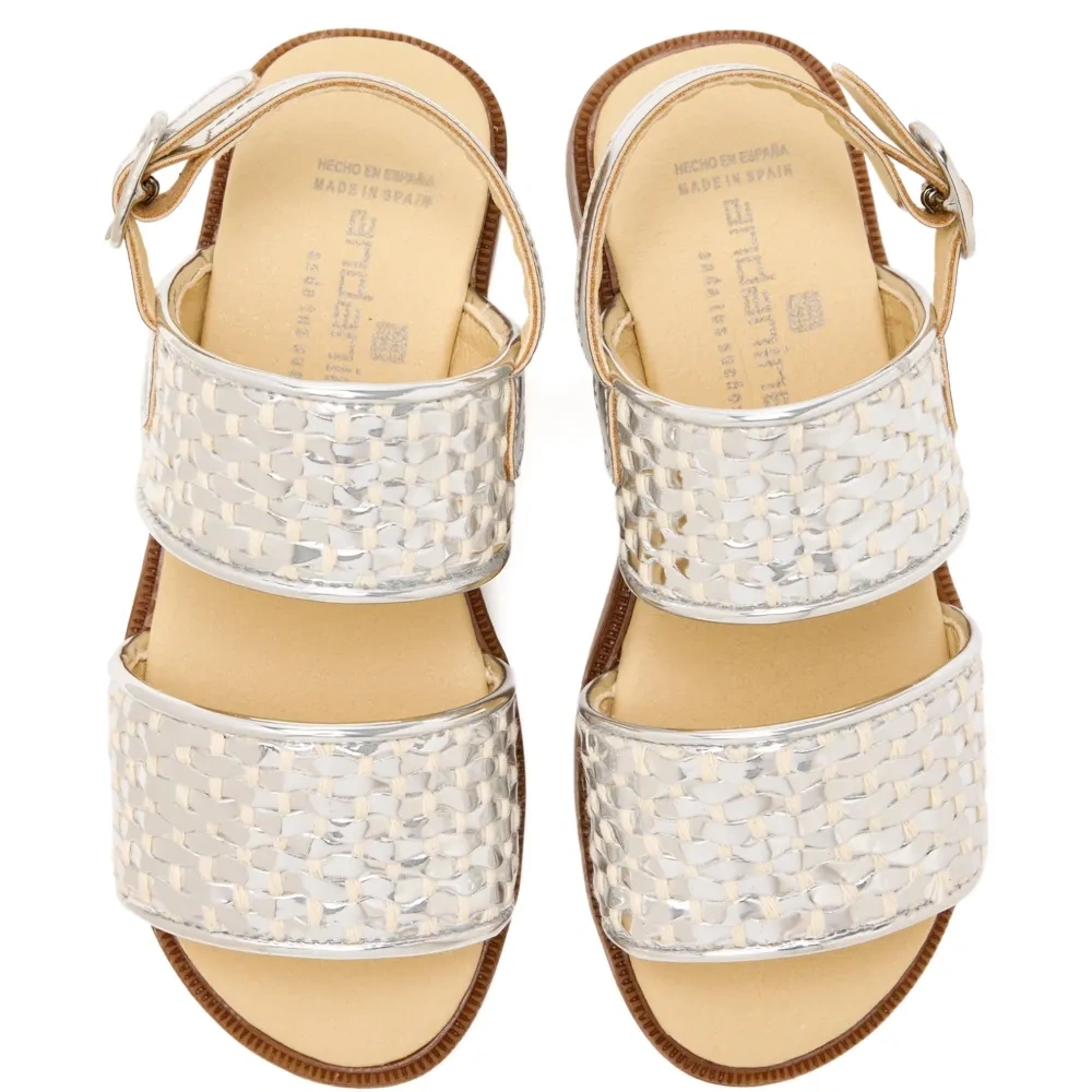 серебристый оттенок, плетёный эффект, застёжка-пряжка, открытый круглый носок, фирменная стелька