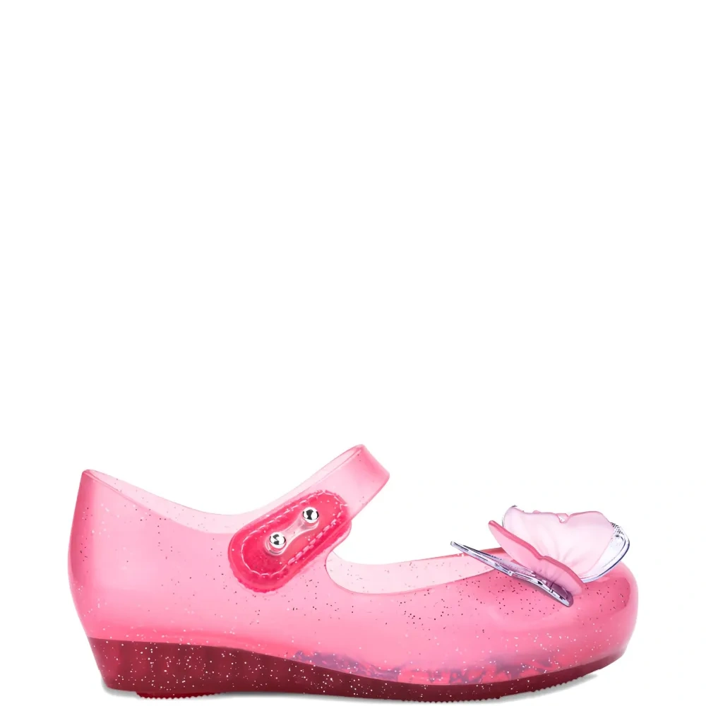 розовый ремешок с украшением в виде бабочки, круглый носок, блестящие детали