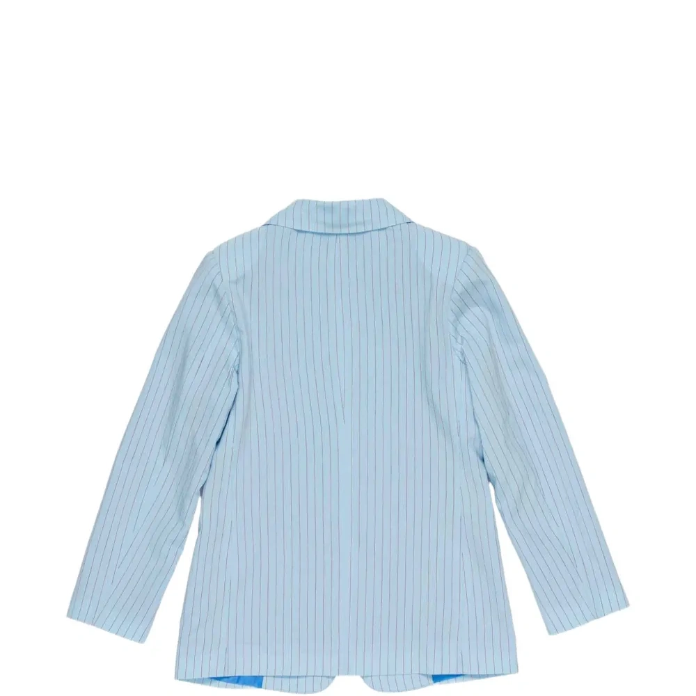 светло-голубой в полоску, застёгивающийся на пуговицы, с острыми лацканами