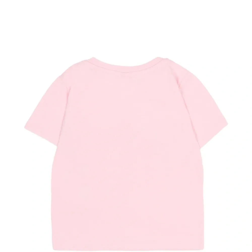 розовая футболка с принтом, круглым вырезом и короткими рукавами