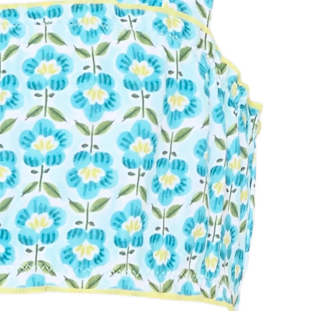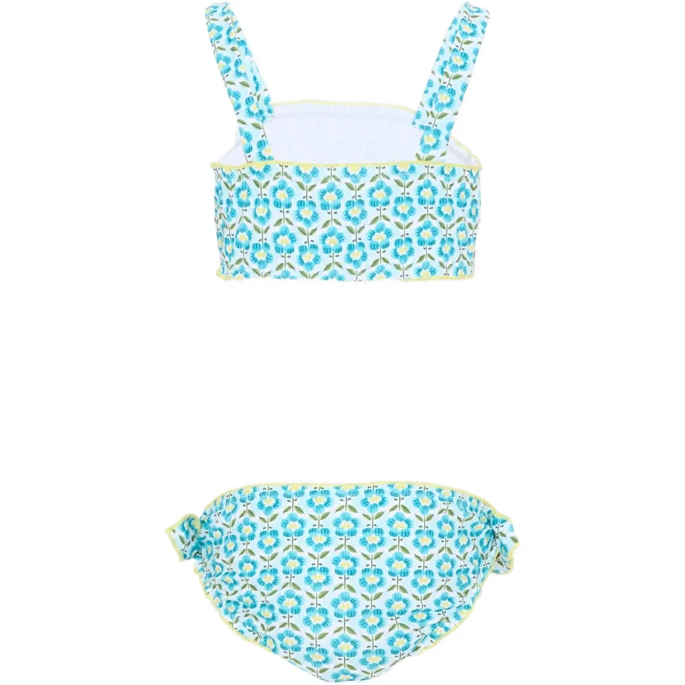 светло-голубой купальник с цветочным принтом по всему изделию, квадратным вырезом и широкими бретелями, надевается без застежек. Пожалуйста, примерьте купальник поверх собственного белья.