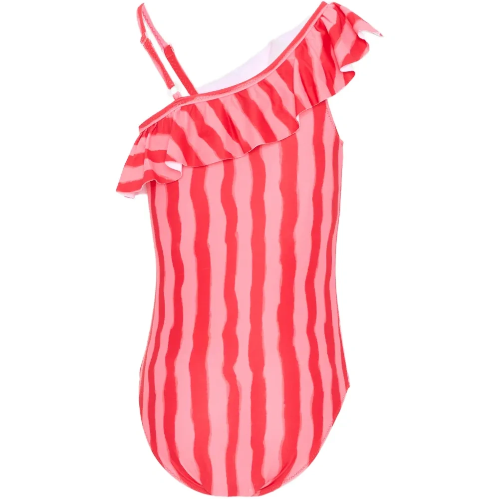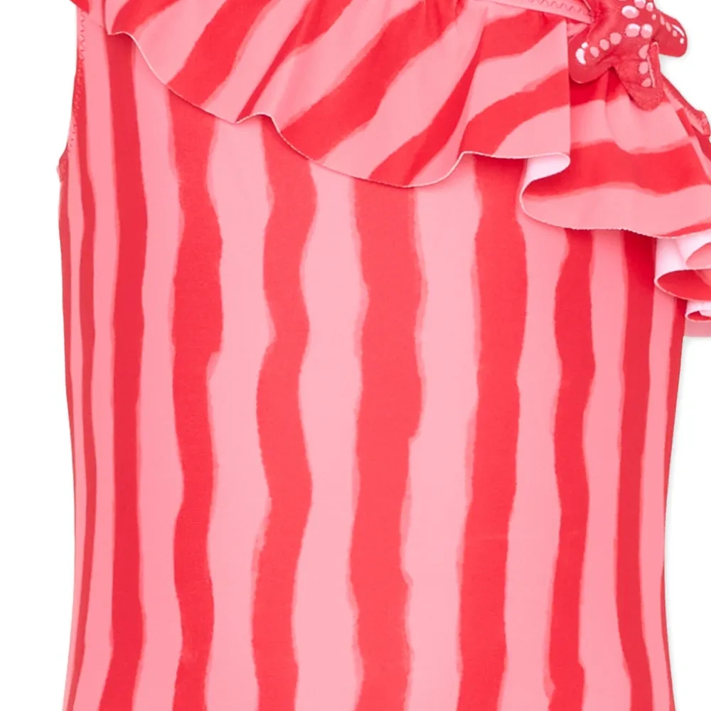 красный/розовый полосатый купальник с оборчатой отделкой, одним плечевым ремнем и асимметричным вырезом. Примеряйте купальник поверх собственного белья.
