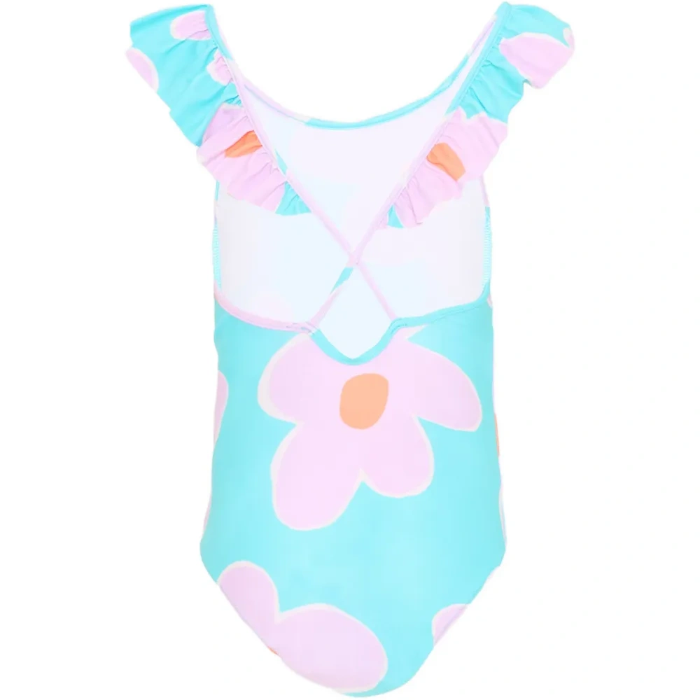 сиренево-фиолетовый/синий/оранжевый цветочный принт, оборки по краю, перекрещивающиеся лямки на спине