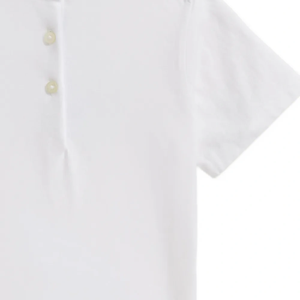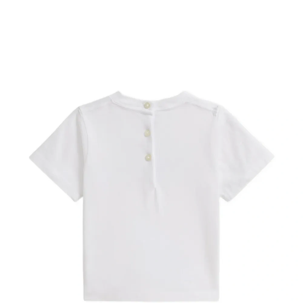 белая футболка с графическим принтом, застежкой на пуговицы, короткими рукавами и круглым вырезом