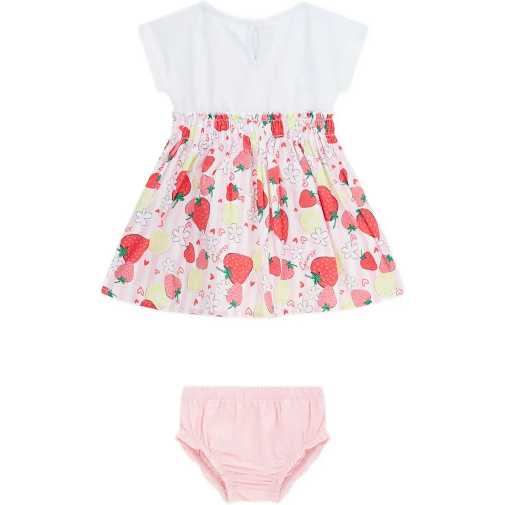 розовый комплект с принтом клубники: футболка с короткими рукавами, круглым вырезом и эластичной талией, в комплекте с подходящими трусиками (блумерами)