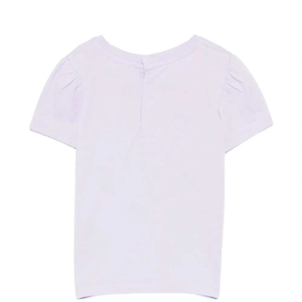 бледно-лиловая футболка с графическим принтом, короткими рукавами, круглым вырезом и застежкой на кнопки сзади