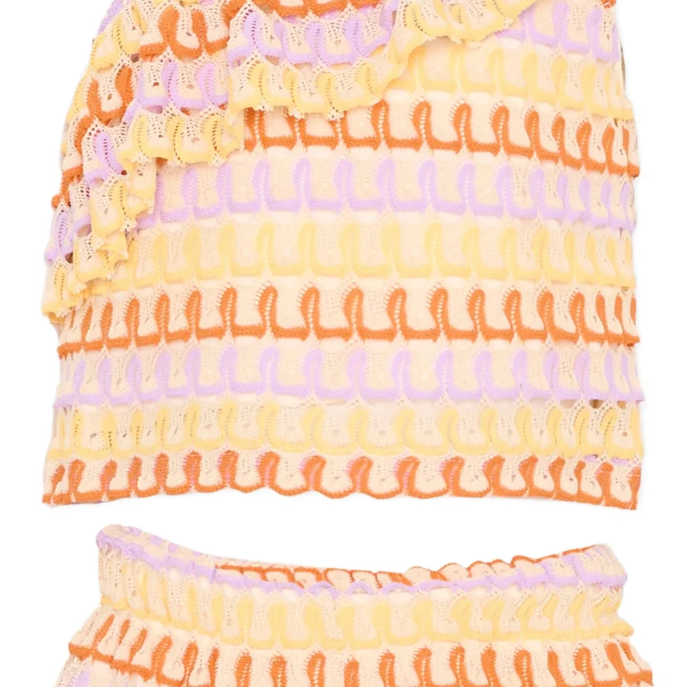 сиренево-фиолетовый/оранжевый/желтый, вышитый дизайн, оборки, асимметричный крой на одно плечо, укороченный подол, высокая талия