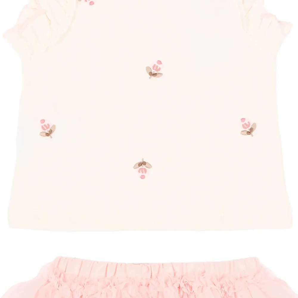 розовый и белый хлопковый топ с цветочным декором, эластичным поясом на талии, оборками и без рукавов