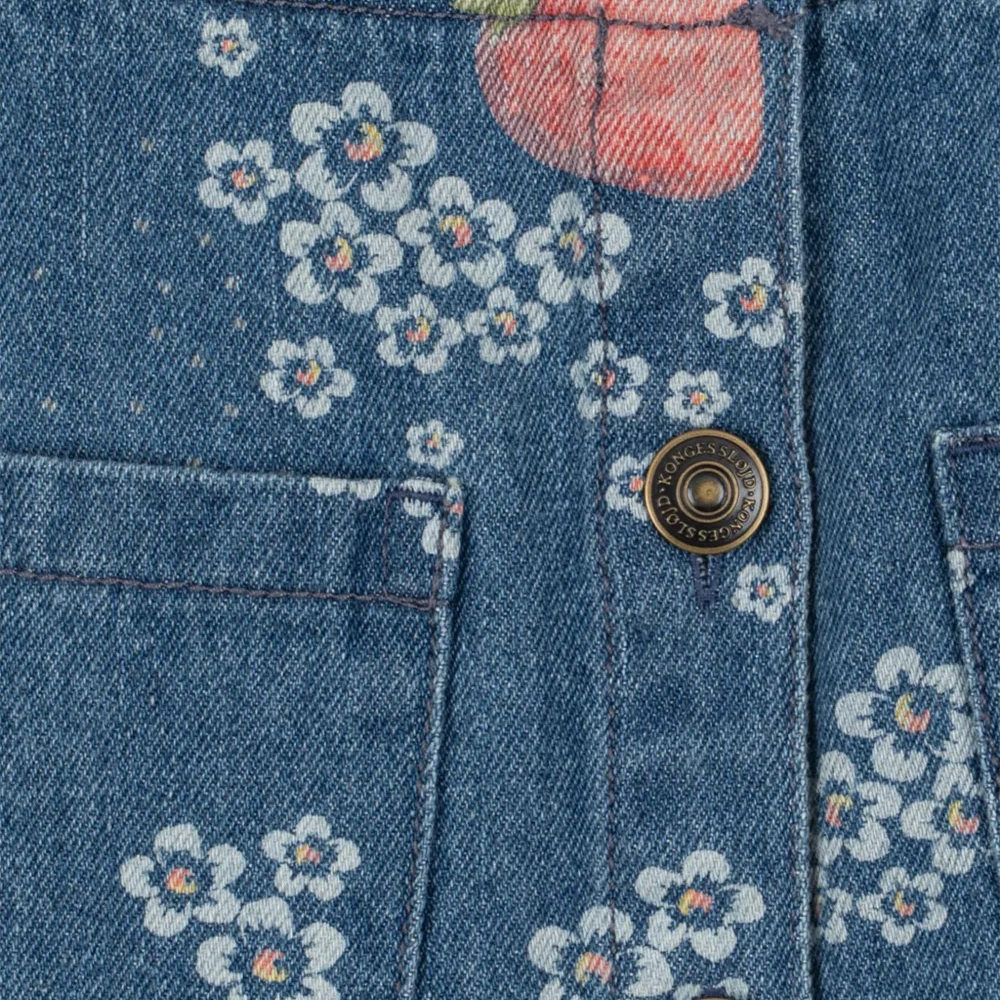 синяя с принтом клубники и цветочным принтом, с эластичным поясом, застежкой на пуговицах и передними карманами