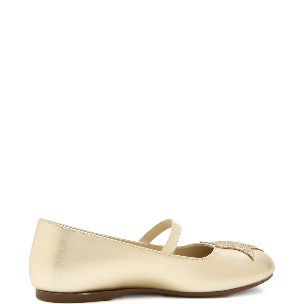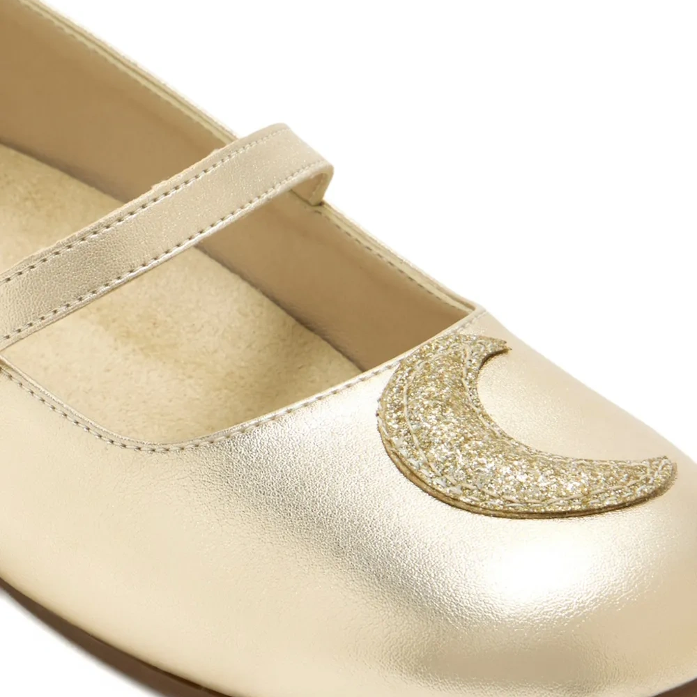золотистый ремешок с блестящим декором, круглый носок, плоская подошва