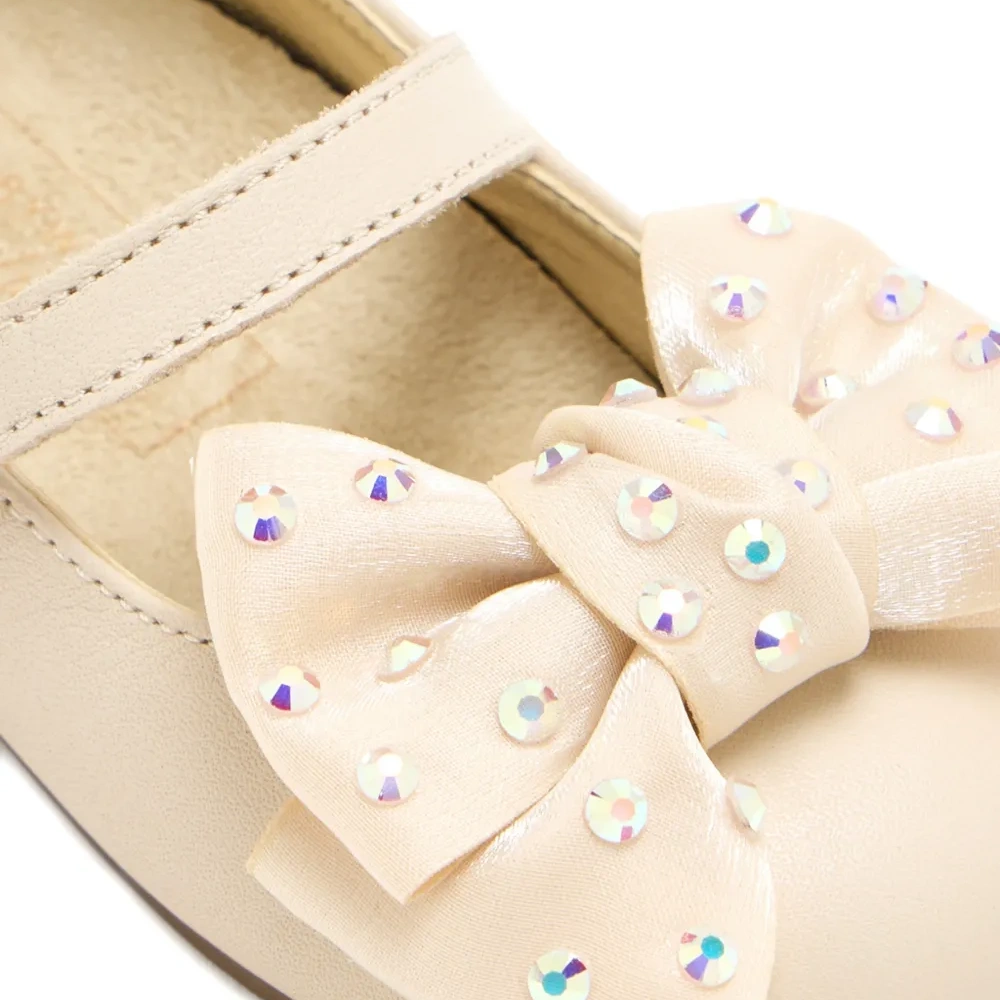 бежевые туфли с украшением в виде банта, ремешком, круглым мысом и плоской подошвой
