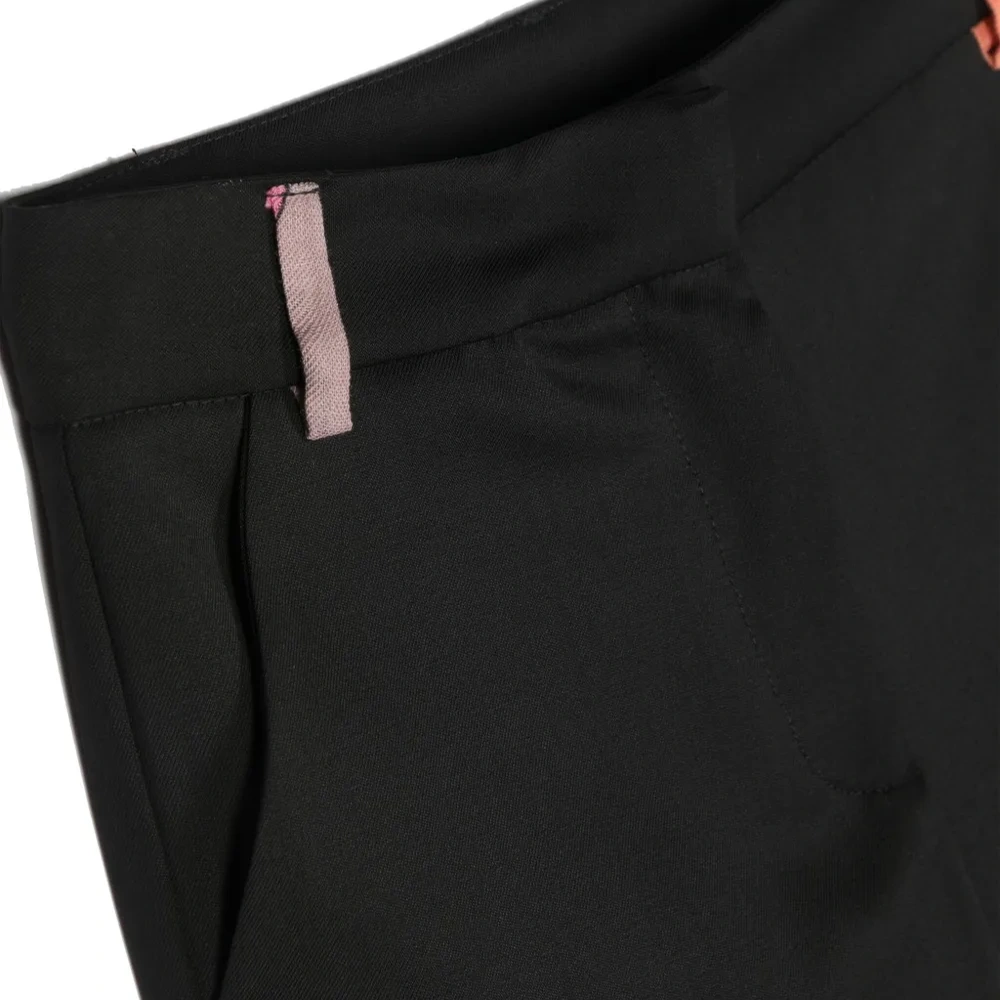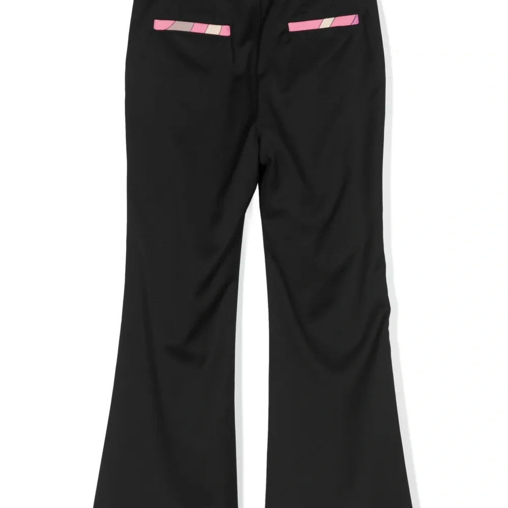 Черный/разноцветный, необработанная шерсть, два прорезных кармана по бокам, контрастный задний карман, расклешенный крой и прямой подол.