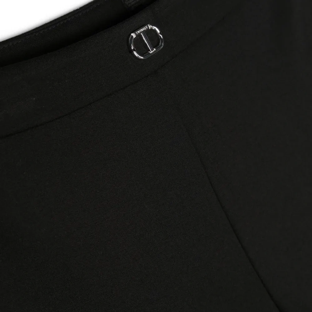 Черный, стрейчевая ткань, серебристый металлический логотип, завышенная талия, потайная застежка на молнии сбоку и расклешенный крой.