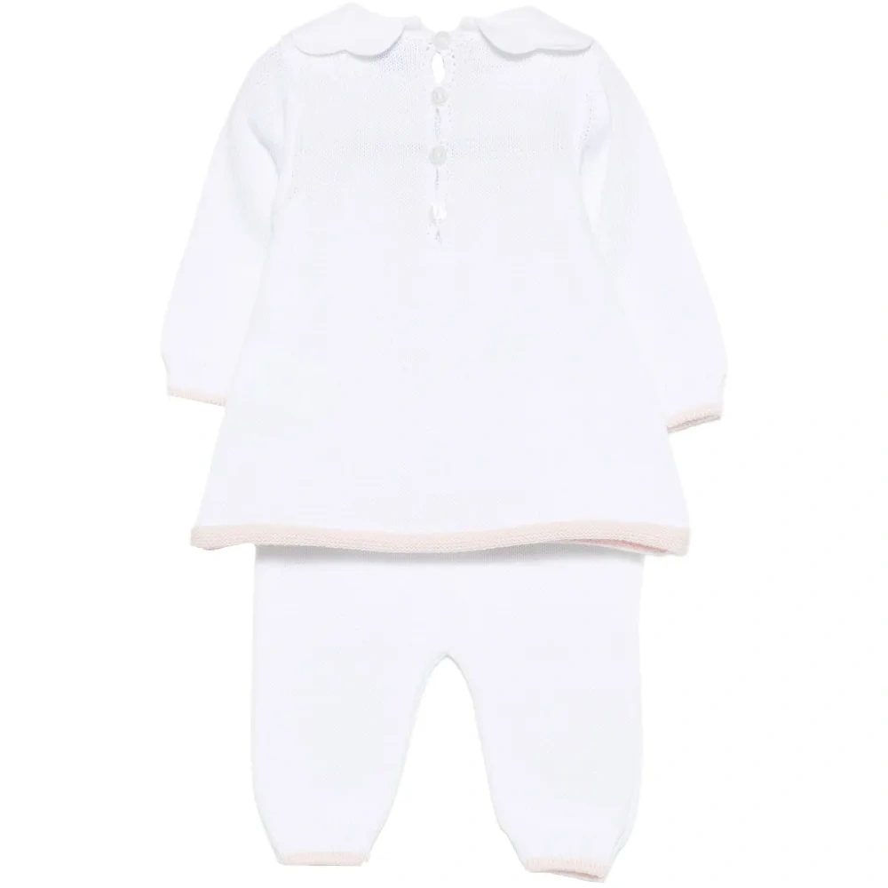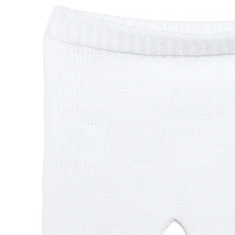 белый свитер с круглым вырезом, вышивкой, длинными рукавами, ребристыми манжетами и застежкой на пуговицы