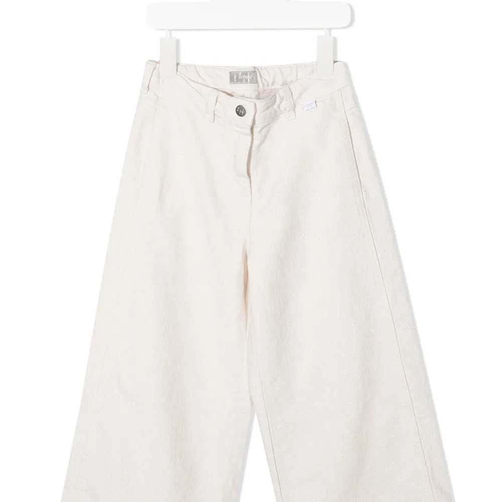 Средняя посадка, петли для ремня, застежка на молнии и пуговице спереди, два накладных кармана сзади и прямой крой.