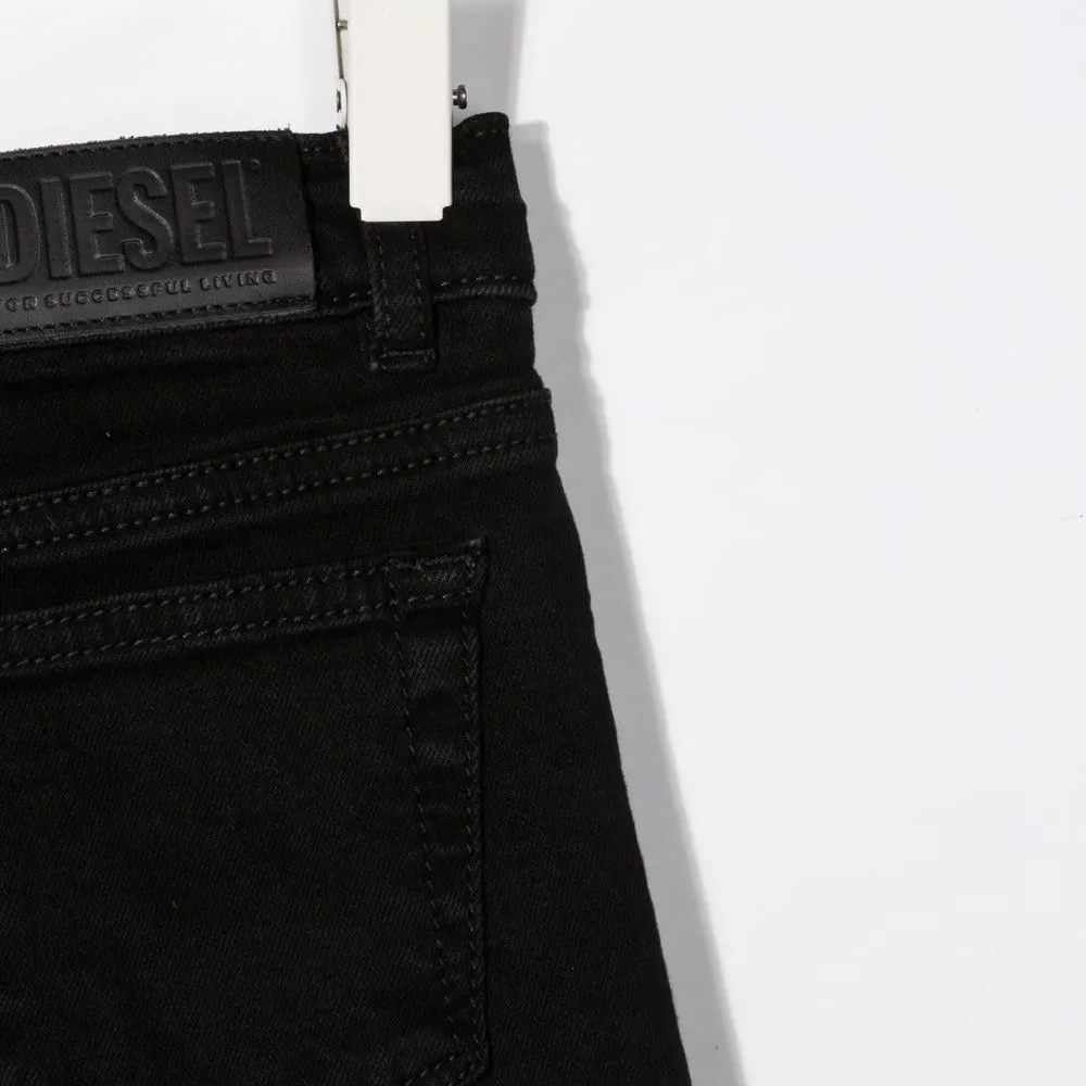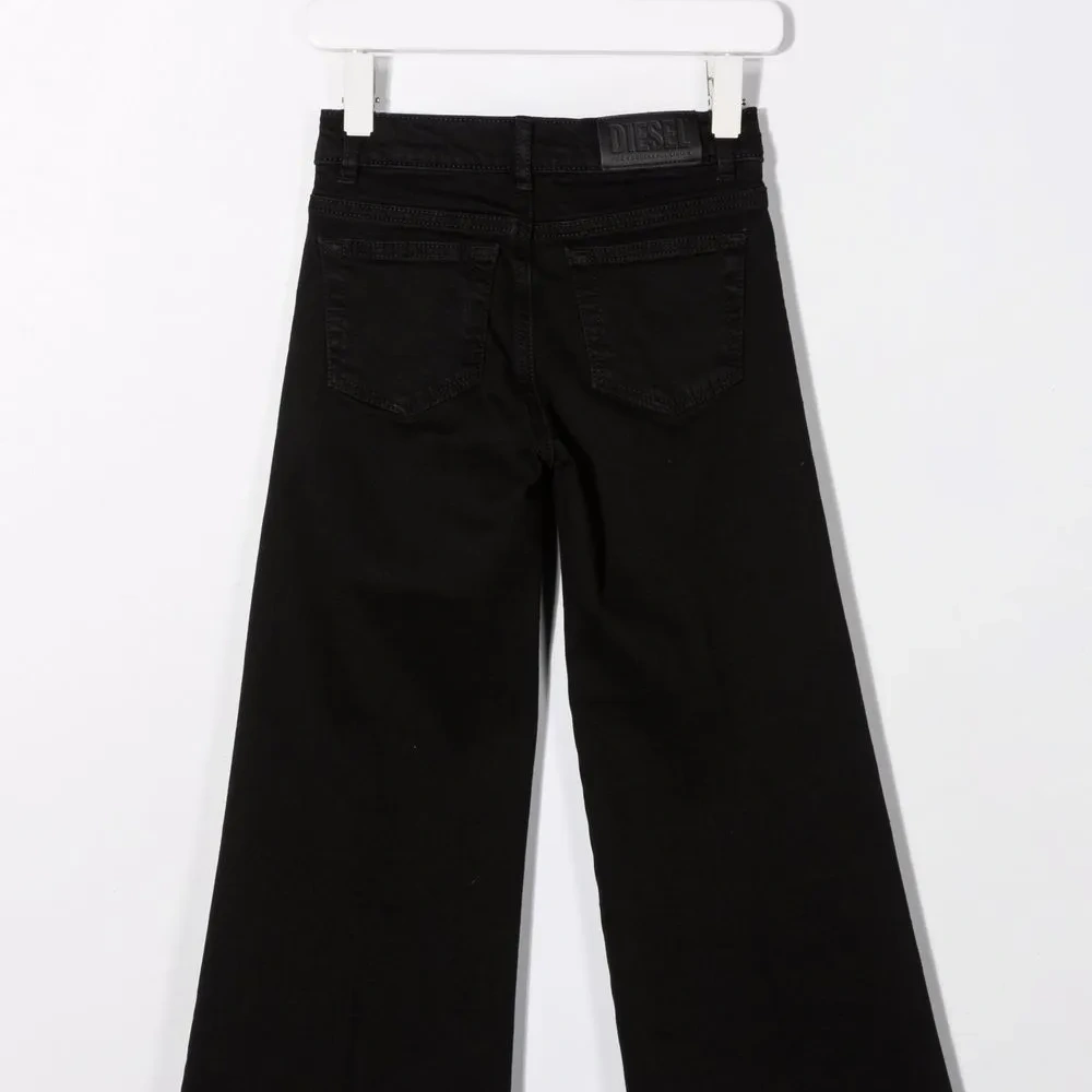 Нашивка с логотипом сзади, петли для ремня, застежка на молнии и пуговице спереди, свободный крой и классическая пятикарманная модель. Цвет: черный.