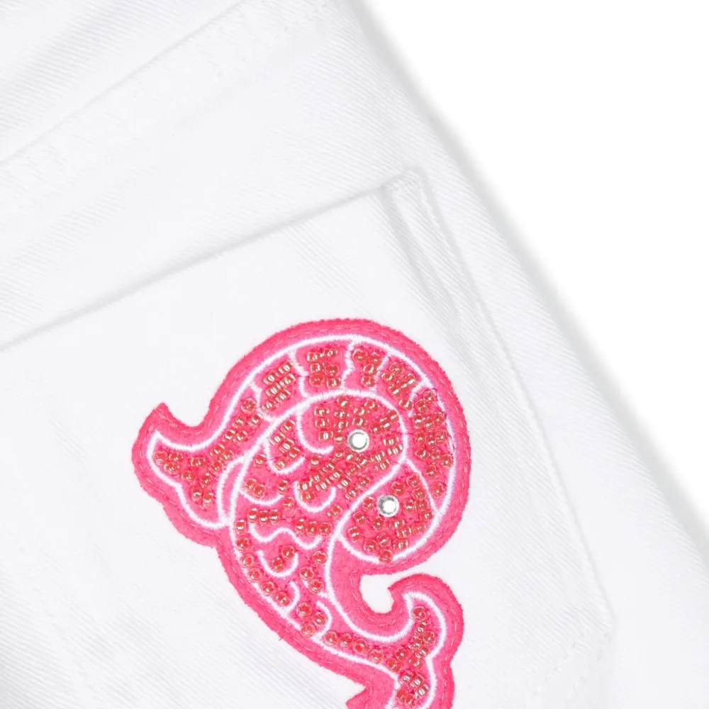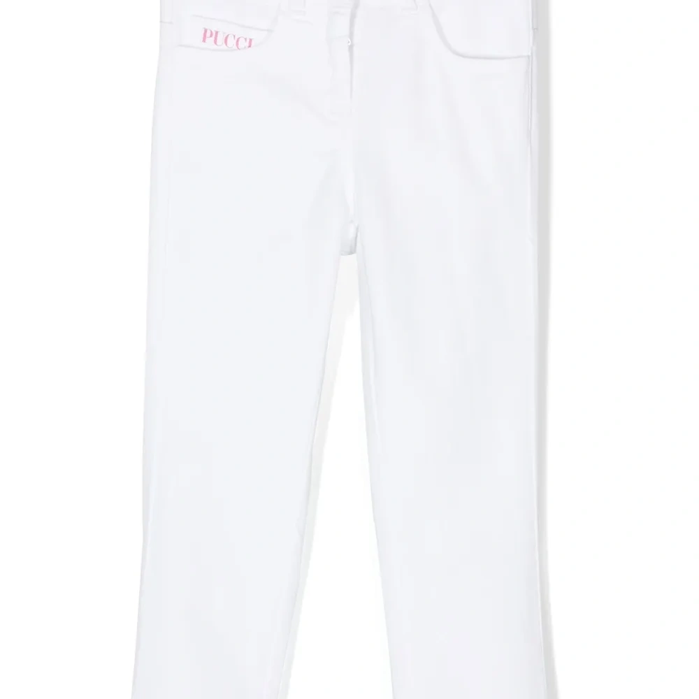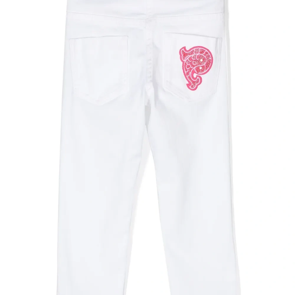Белый, смесовый хлопок, узкий крой, нашивка с логотипом сзади, потайная застежка на молнии и пуговицах и пять карманов.