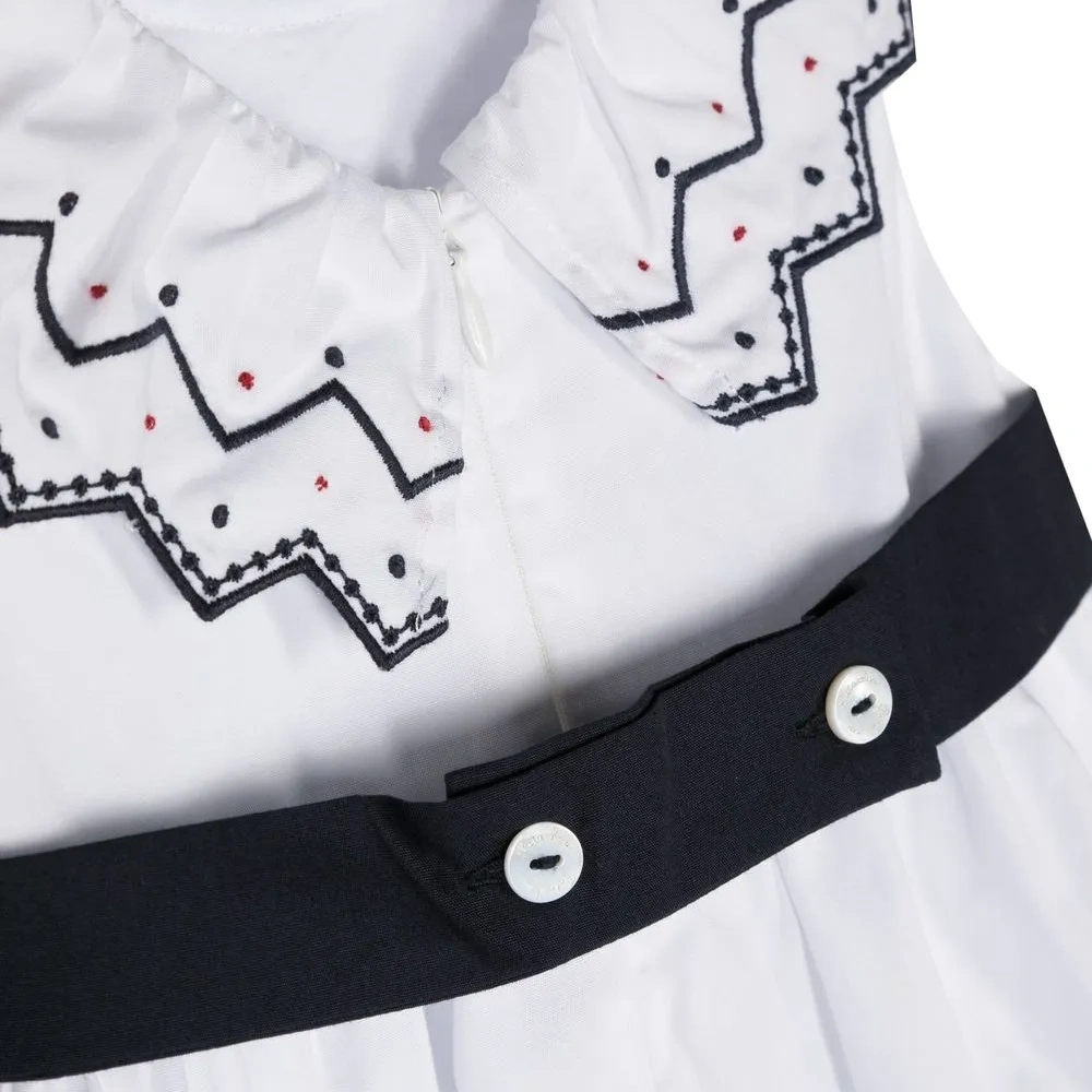 Зигзагообразная вышивка, дизайн со сборками, бант, застежка на молнии сзади, круглый вырез, без рукавов, пышная юбка и прямой подол.