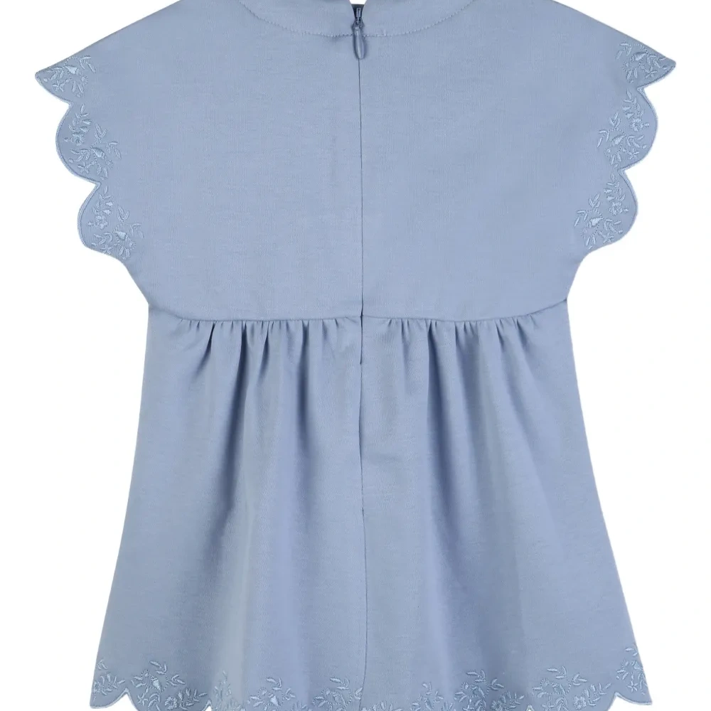 синий топ с зубчатой отделкой, присборенными деталями, короткими рукавами и круглым вырезом