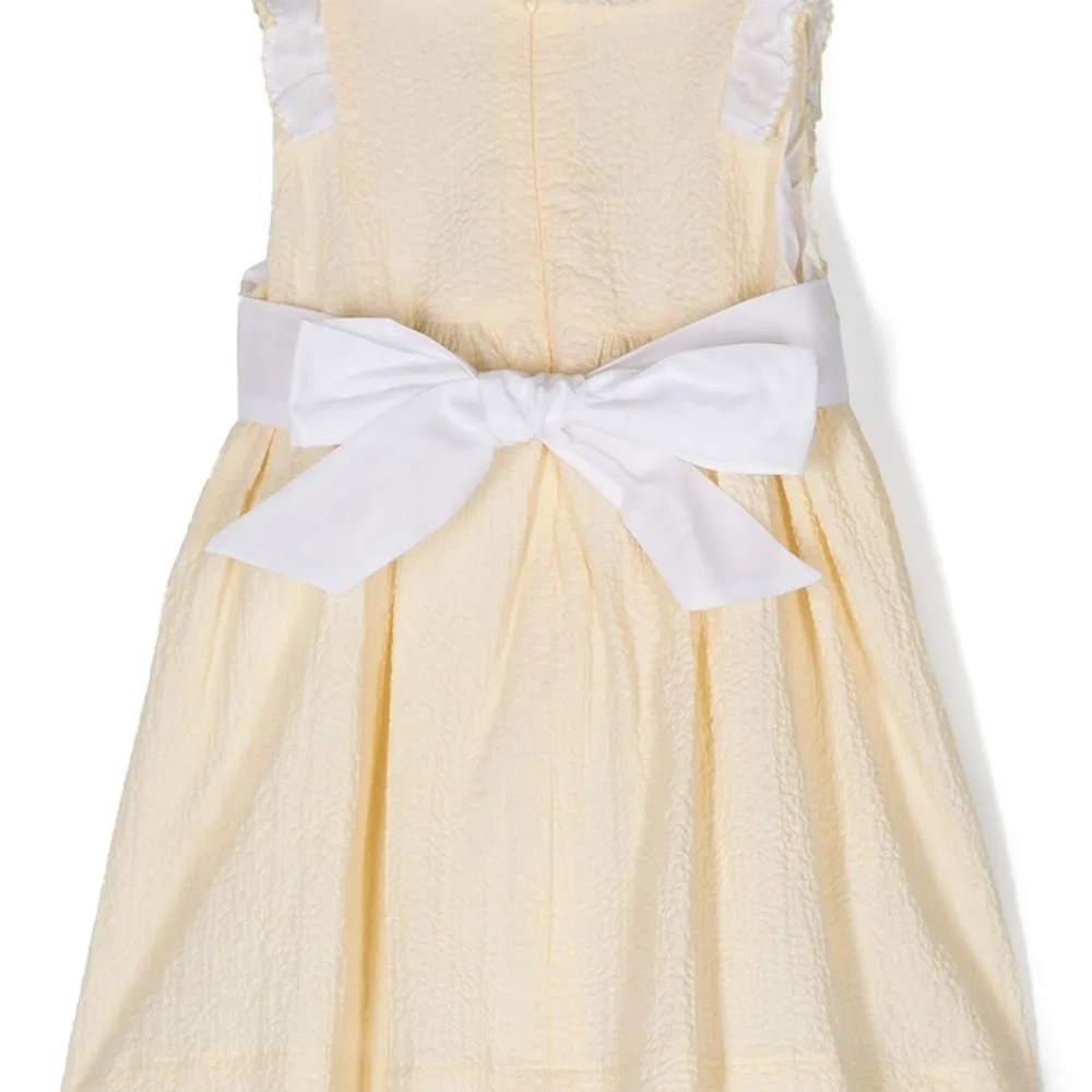 Сирсакер, гофрированный эффект, вставки с оборками, застежка на завязке сзади, круглый вырез, без рукавов, пышная юбка и прямой подол.