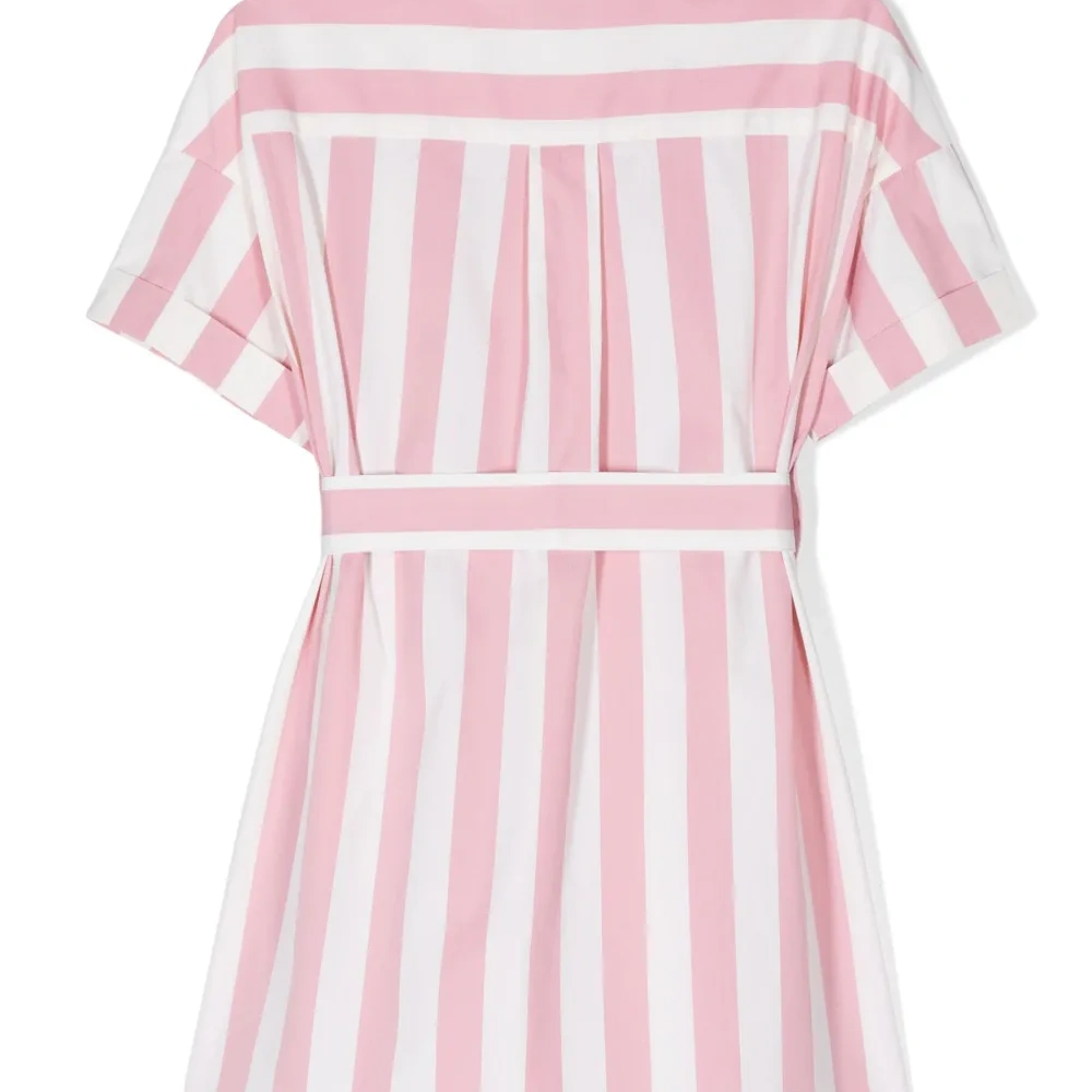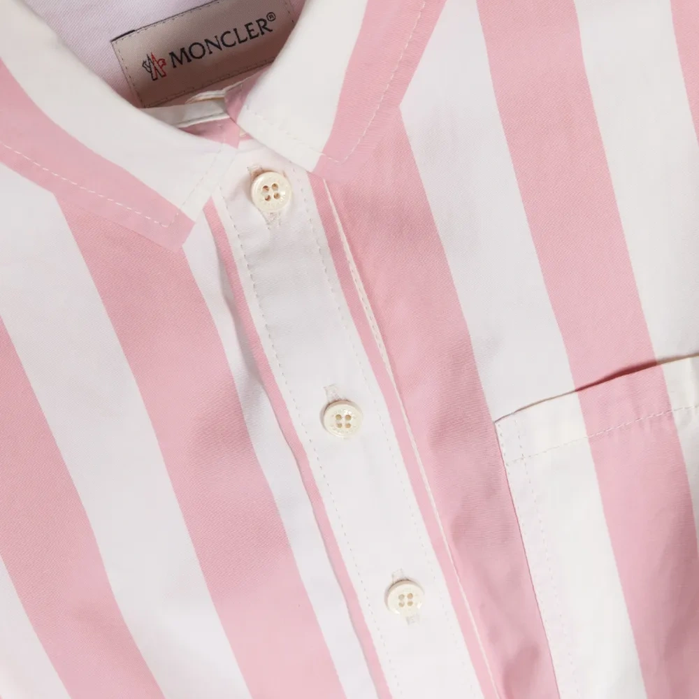 Расцветка Blush Pink, белый, хлопок, принт в вертикальную полоску, нашивка с логотипом на рукаве, классический воротник, застежка на пуговицах спереди, короткие рукава, подвернутые манжеты, нагрудный накладной карман, ремень на талии и петли для ремня.