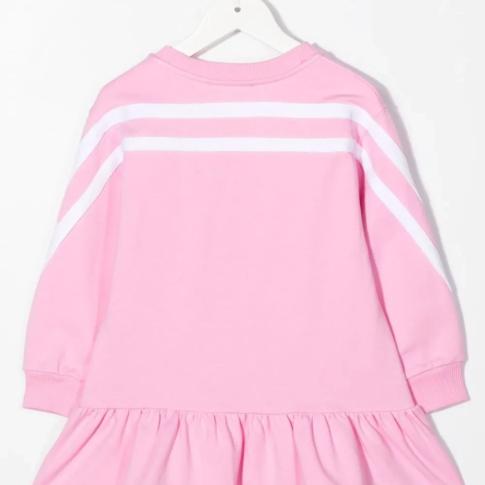 Светло-розовый, эластичный хлопок, мультипликационный принт, края в полоску, украшения из горного хрусталя, круглый вырез, длинные рукава, рукава с узкими манжетами и подол с оборками.