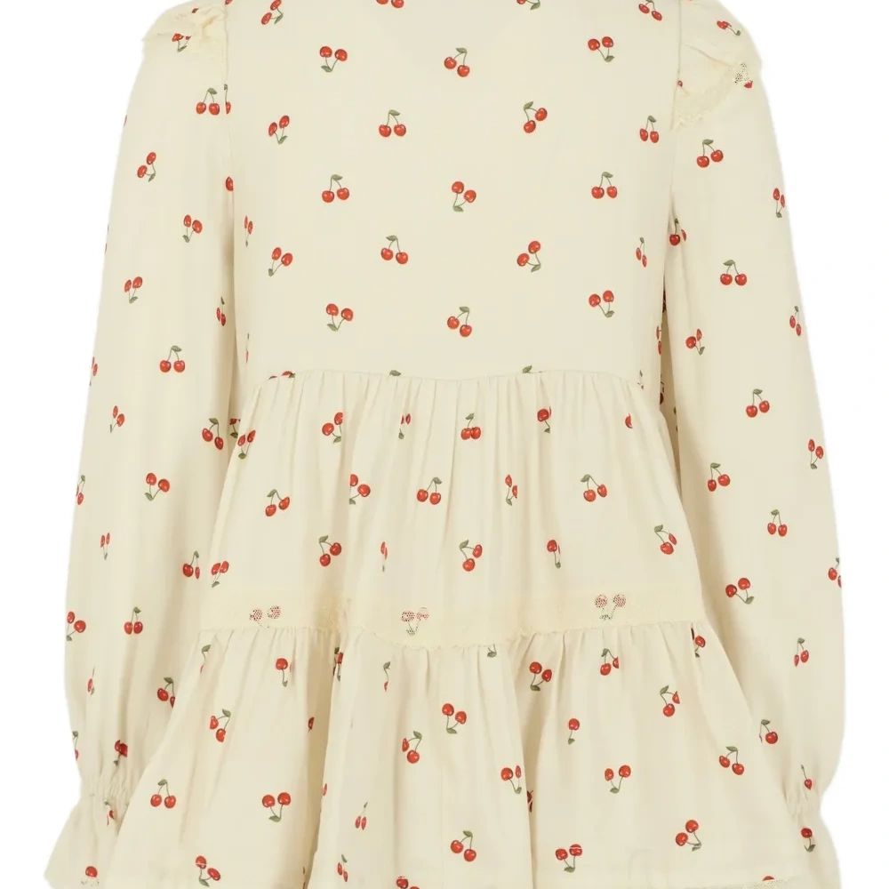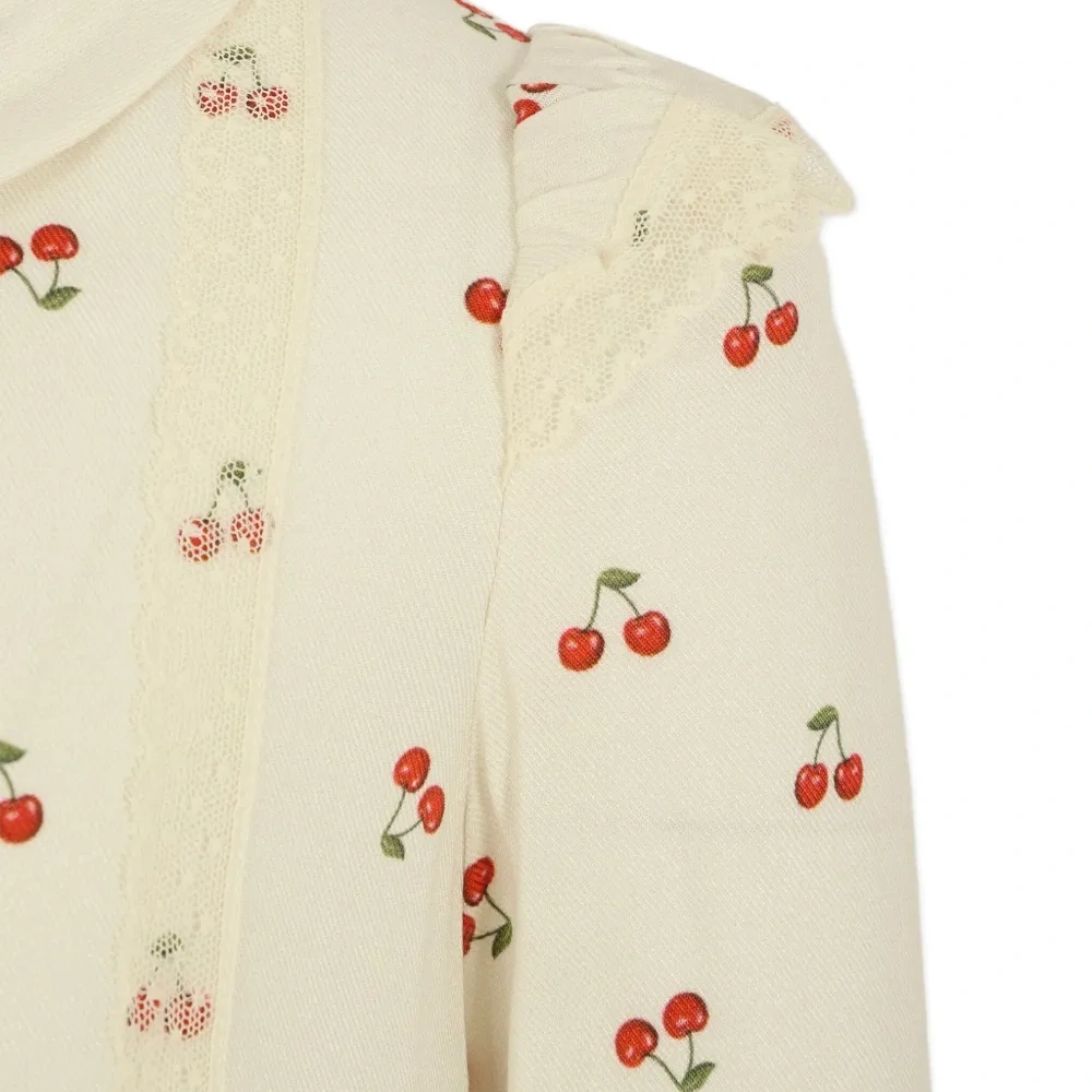 белоснежная юбка вишневого принта с кружевной отделкой, длинными рукавами, застёжкой на пуговицы и многослойным кроем