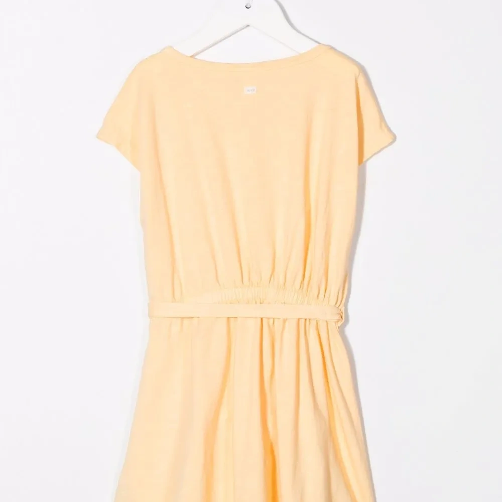 Нашивка с логотипом сзади, U-образный вырез, эластичный пояс на шнурке, ремень на талии, короткие рукава и расклешенный крой. .