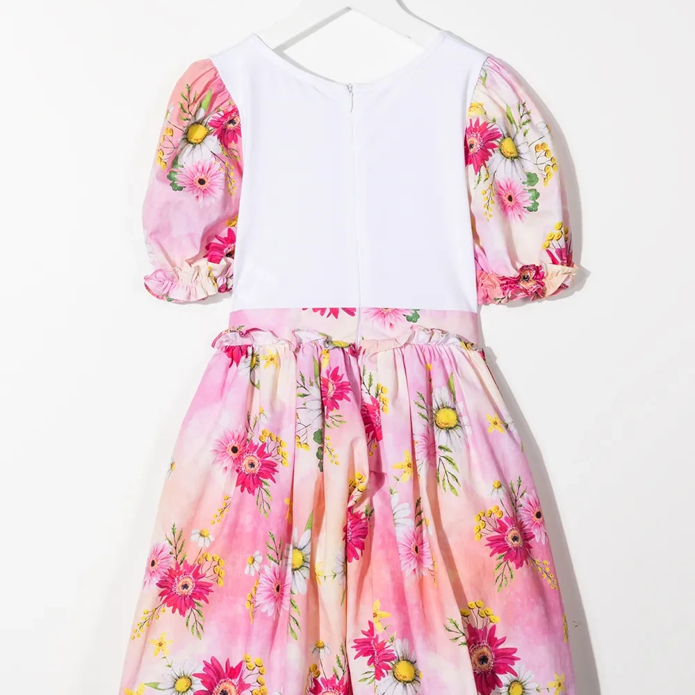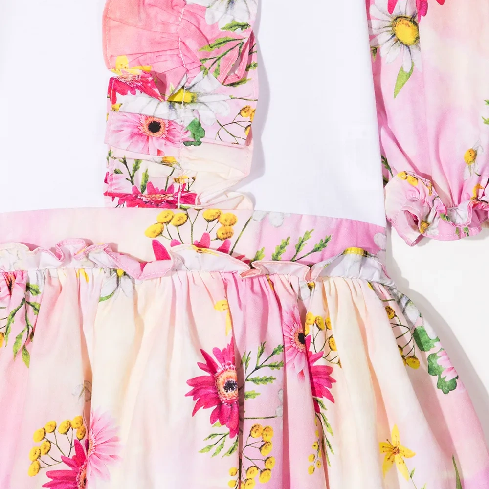 Сплошной цветочный принт, вставки, круглый вырез, короткие рукава и подол с оборками.