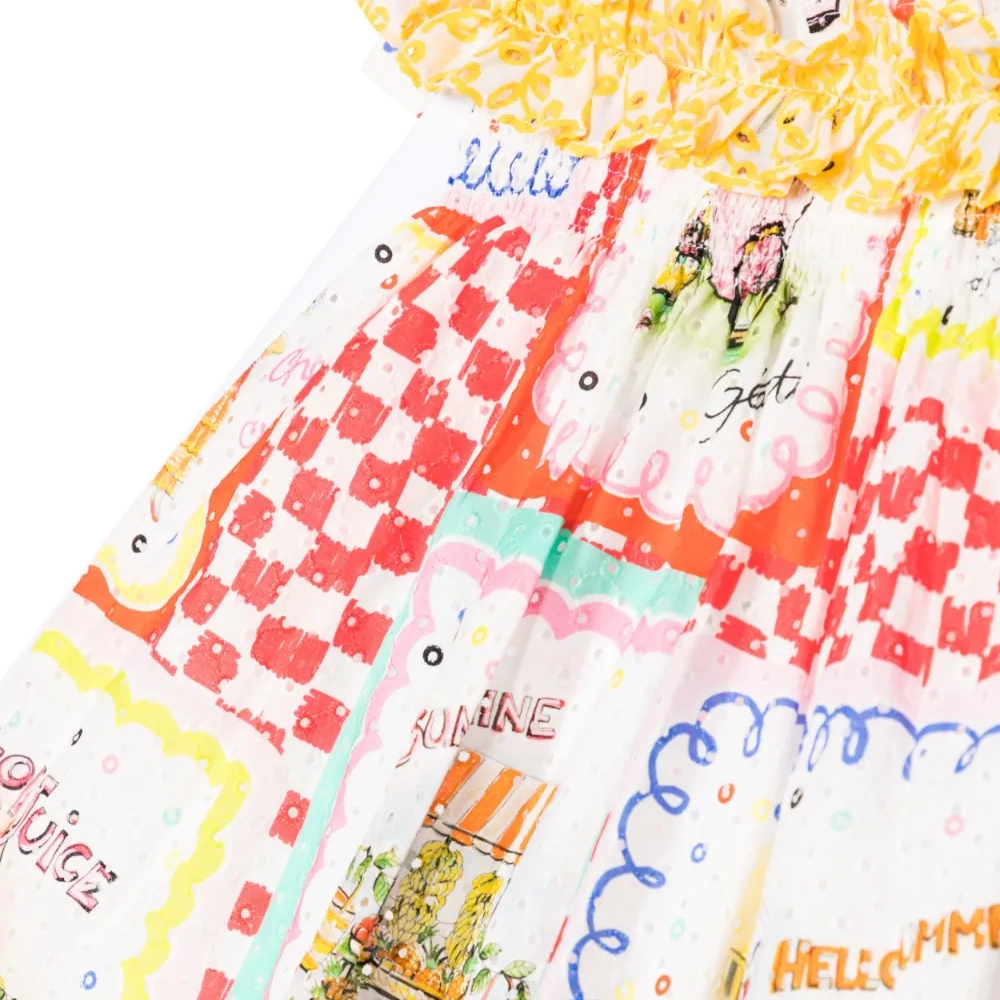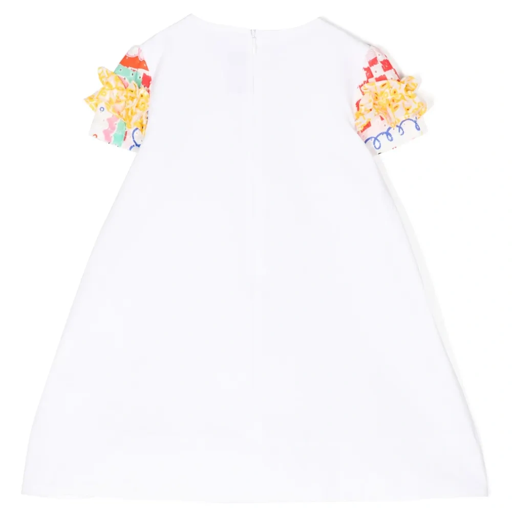Белый, разноцветный, эластичный хлопок, принт-иллюстрация, отделка с оборками, круглый вырез, короткие рукава, потайная застежка на молнии сзади и расклешенный подол.