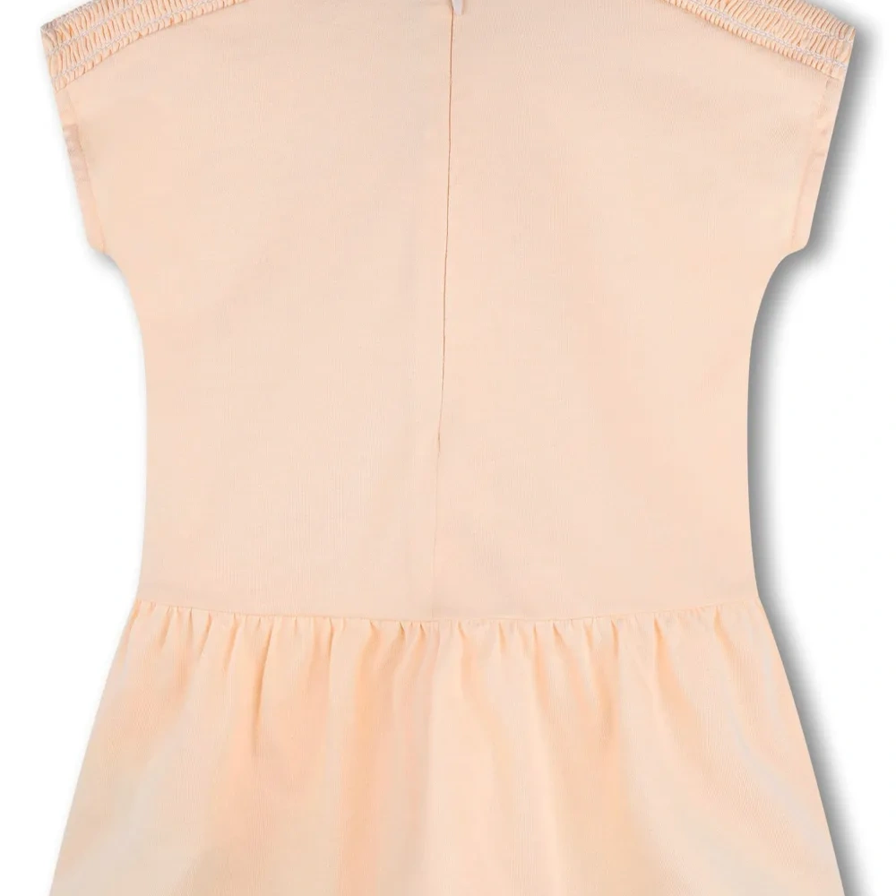 Лососевый, органический хлопок, вышитый логотип спереди, заклепки, вставка со сборками, круглый вырез, короткие рукава, складки и прямой подол. Узнать больше о том, какие товары получают отметку «Ответственный выбор», можно из материала «Как мы оцениваем экологичность и этичность».